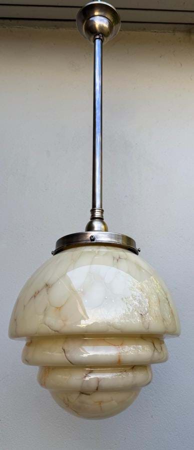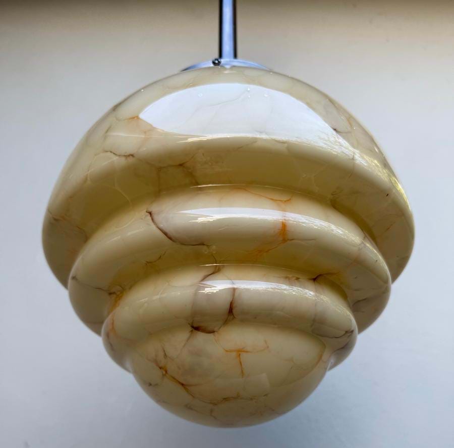 An impressive large 1930's Deco moulded/stepped cream glass deco light shade with brown veining.