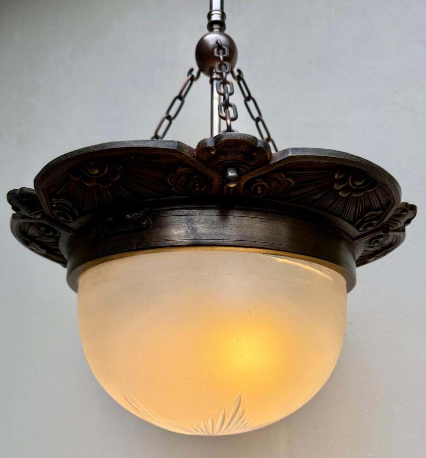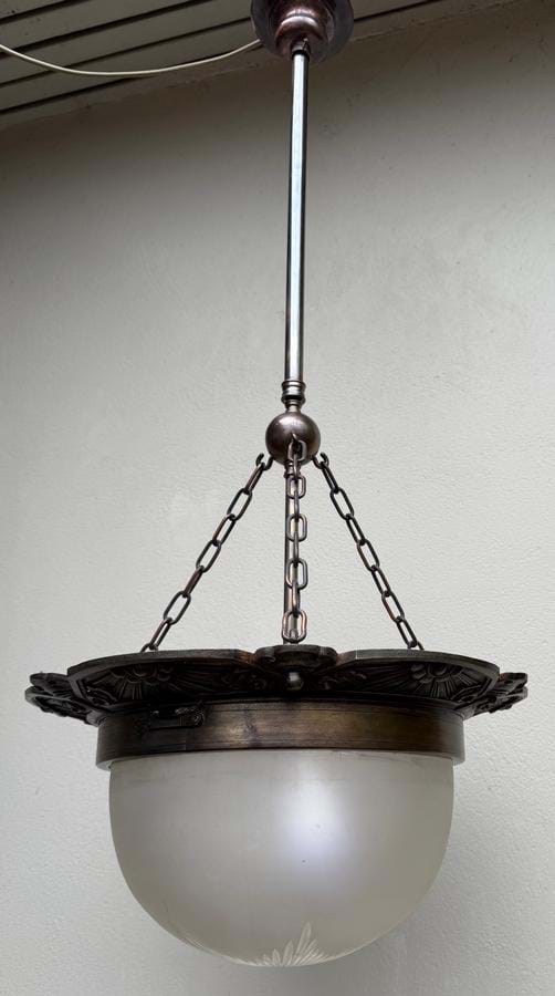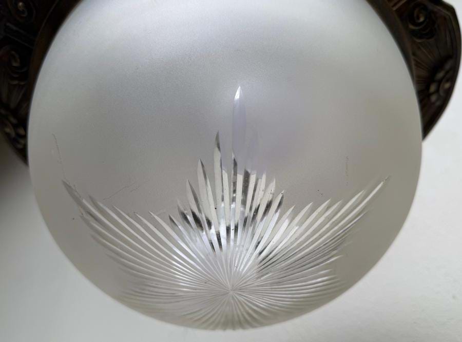 An impressive large 1930's French Deco bronze plaffonier with frosted glass shade incorporating a wheel cut starburst design.