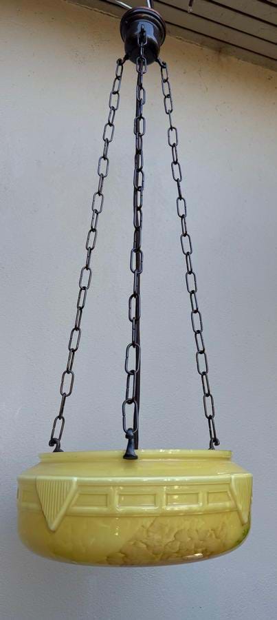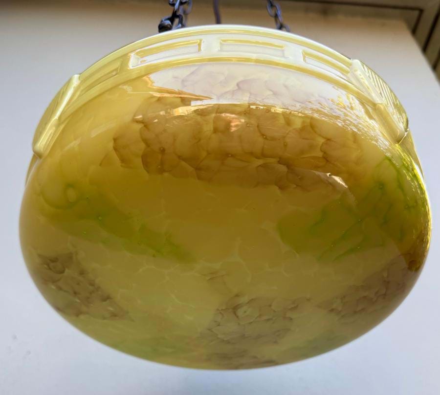 An original 1930's cased yellow glass ceiling light shade with brown/green veining.