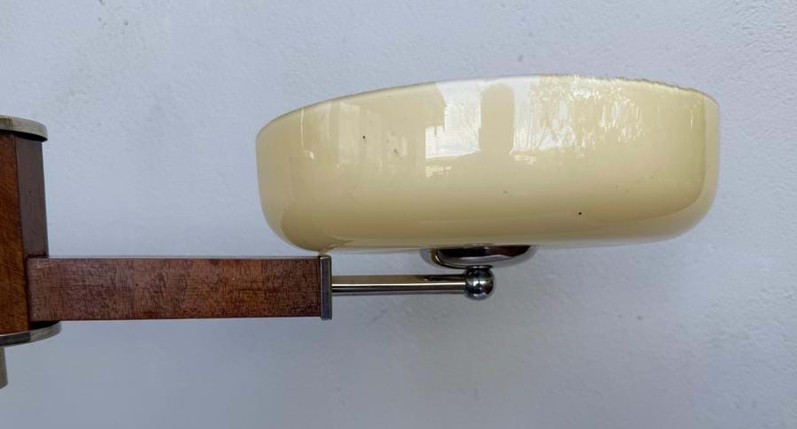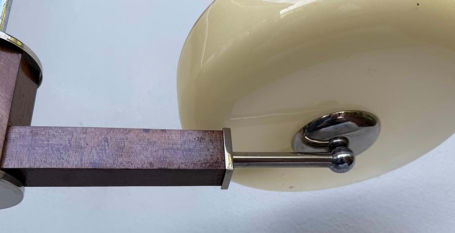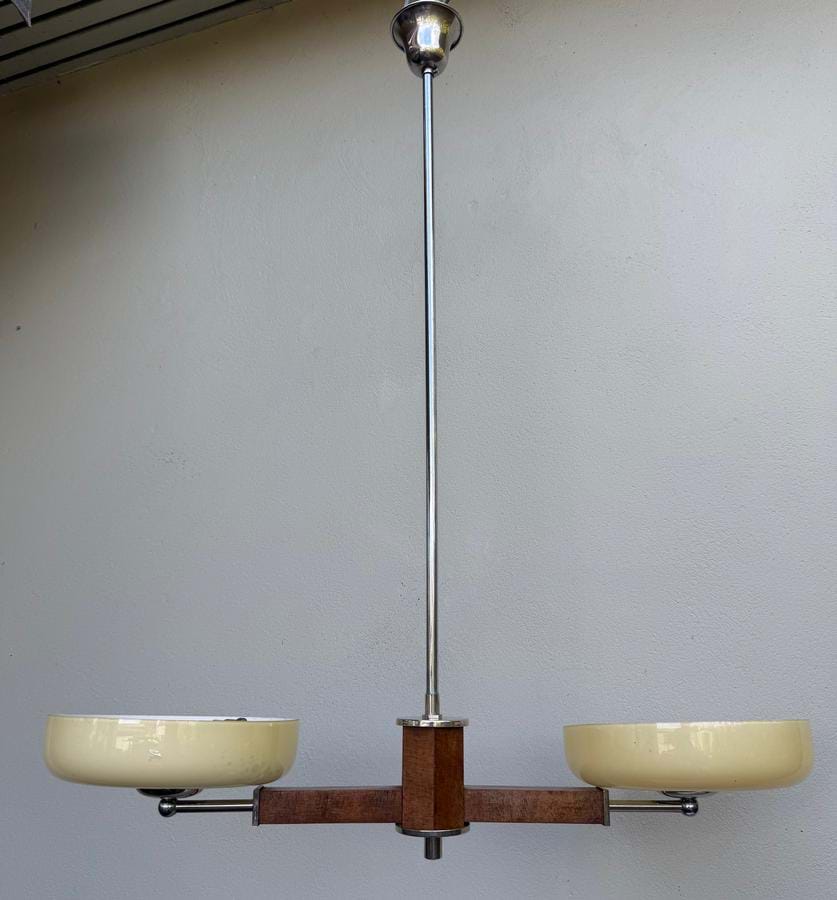A large 1930's German Deco chromed brass and timber 2 light pendant with its original cream/cased glass shades.
