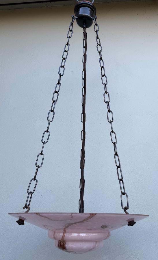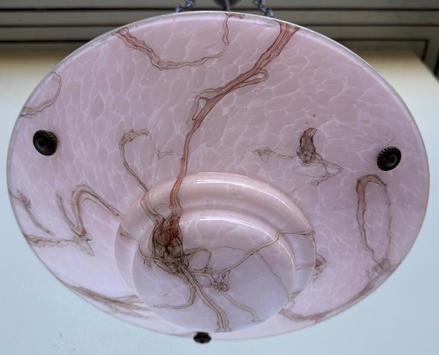 A beautiful large 1930's French Deco moulded pink/cased glass ceiling light shade with caramel/brown veining.