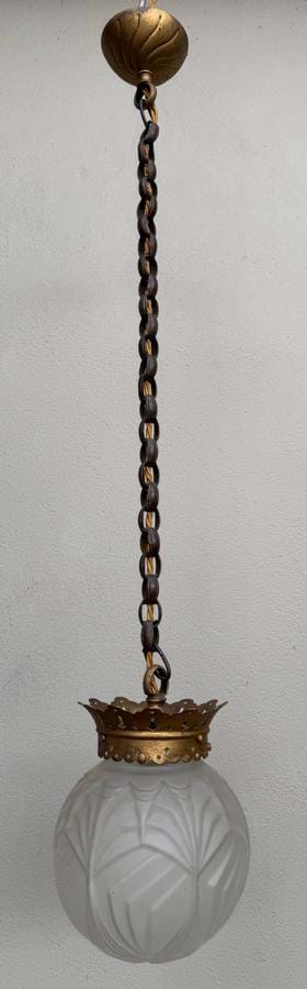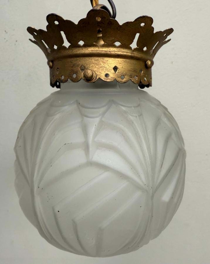 A 1930's French Deco moulded clear/frosted orb shade with re-wired original brass suspension fittings.
