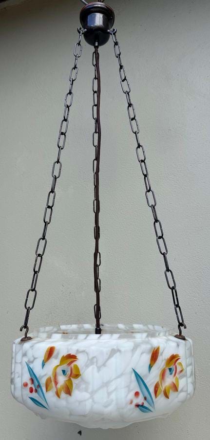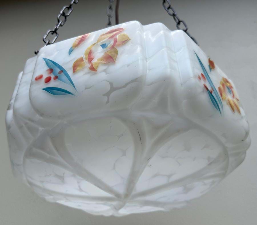 A beautiful large 1930's English Deco moulded/marbled off white glass light shade with applied orange/red/blue stylised floral decoration around the side.