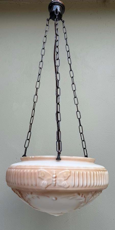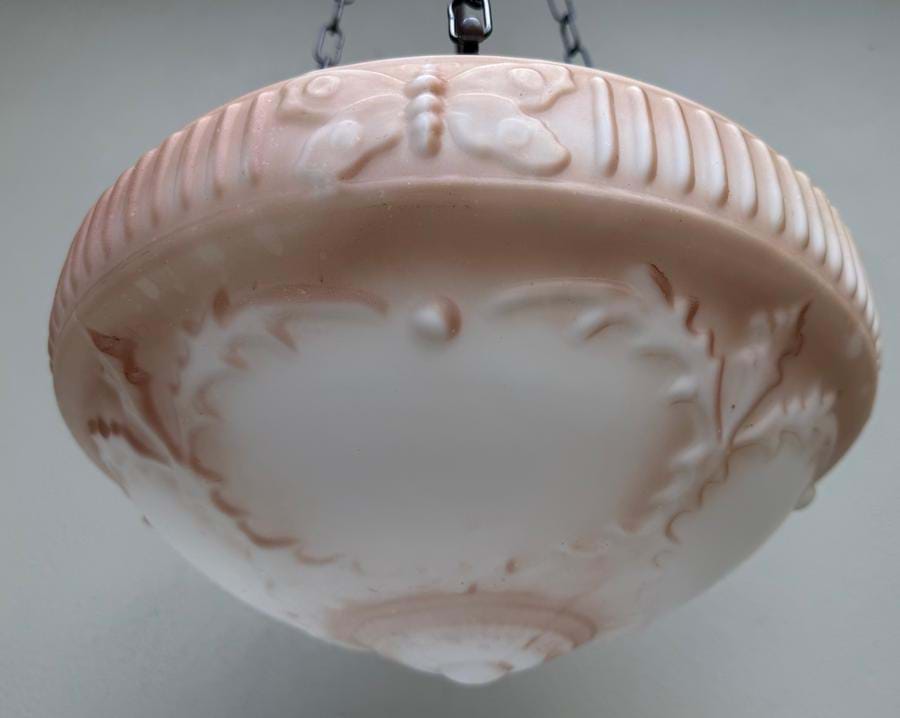A large 1930's Deco moulded white/pink glass ceiling light shade with foliage decoration on the base and butterflies around the rim!