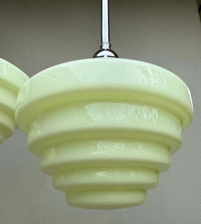 1930's Deco pale cream/lemon stepped uranium glass shades...which do glow under Uv light!