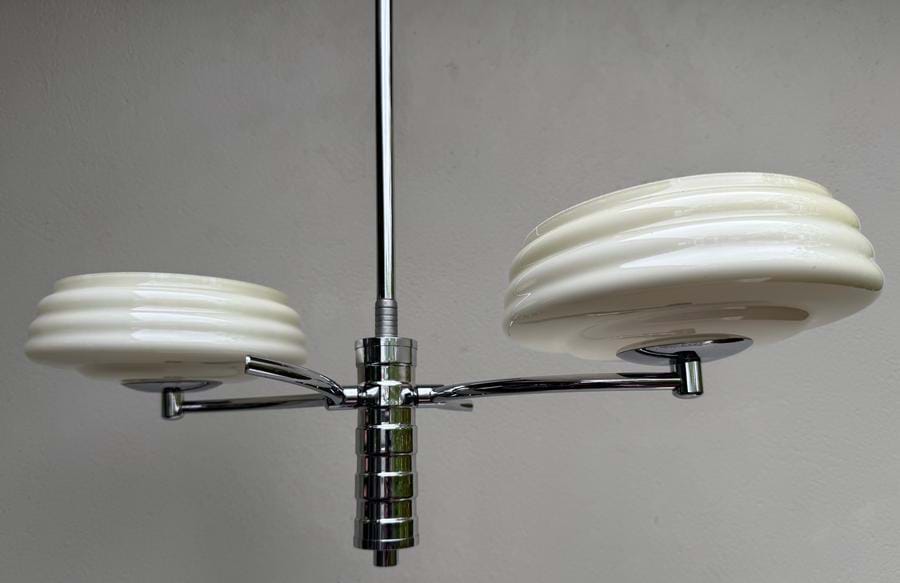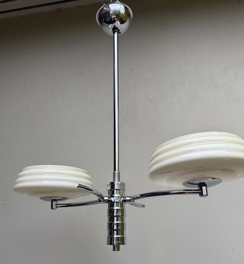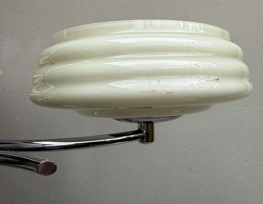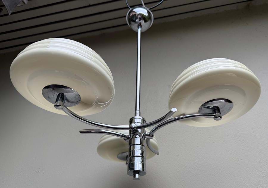 Set of 1930's English Deco chromed brass curved arm pendant lights with their original moulded cream glass shades.