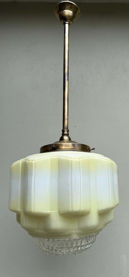 Comes with aged brass/bronze rod suspension and is in excellent condition.