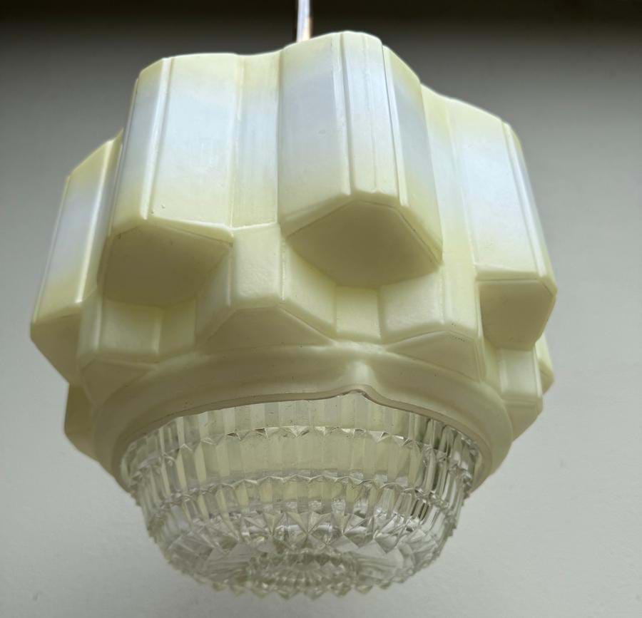 Large 1930's Deco white glass 'cogwheel' ceiling light shade with yellow highlights and clear prismatic glass base.