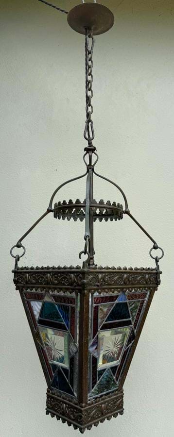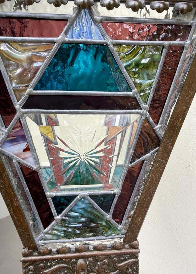 Fixture has a lovely original patina and very colourful panels, each with a central wheel cut starburst design clear glass pane.