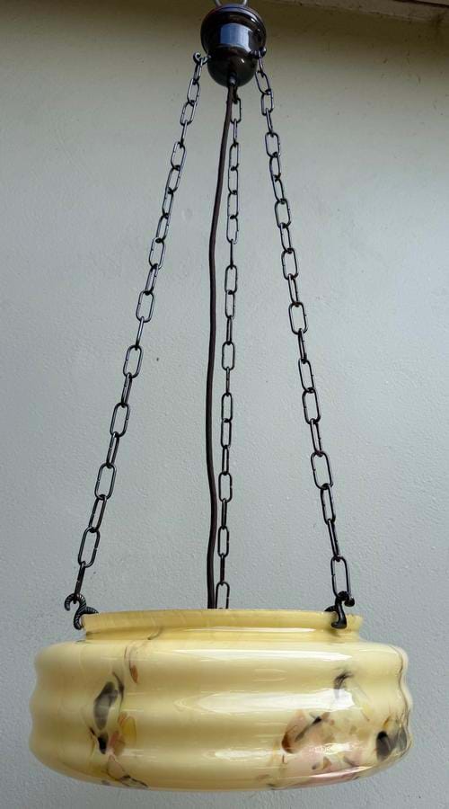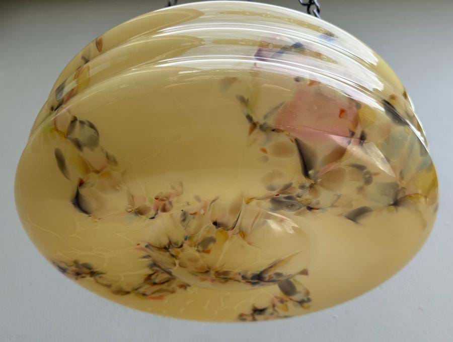 A large 1930's Deco moulded/ribbed cream-yellow glass ceiling light shade with black/grey/pink veining.