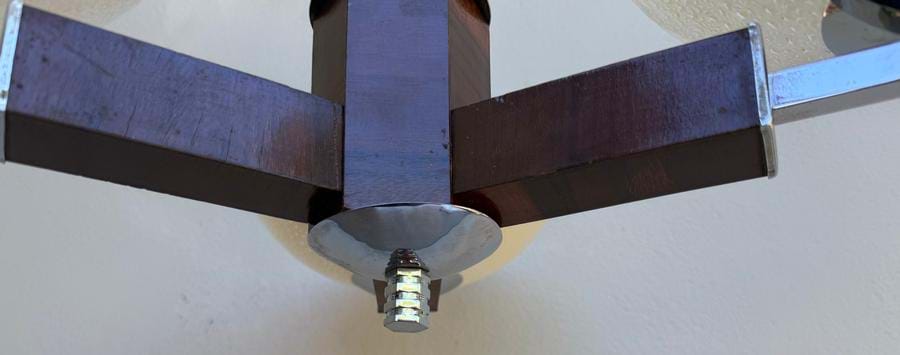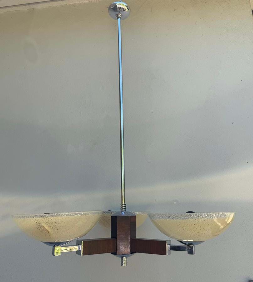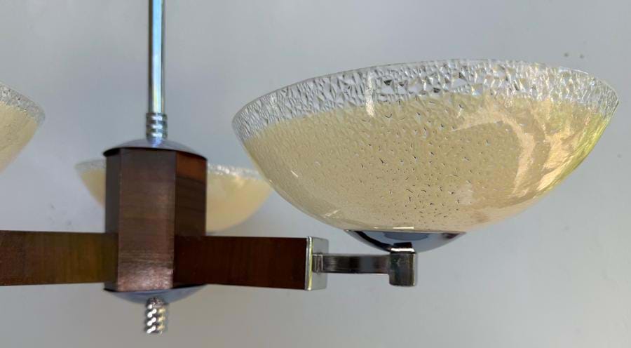 An attractive 1930's English Deco chrome and timber 3 light chandelier with original cream/clear textured glass shades.