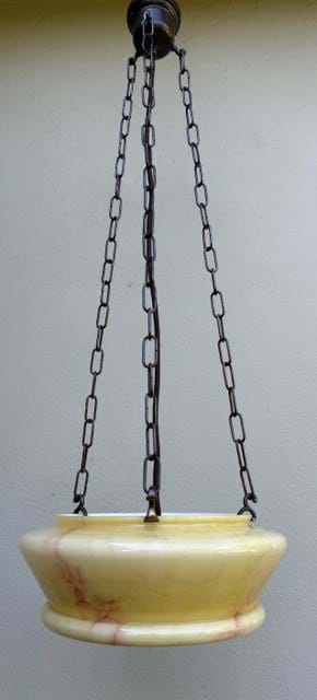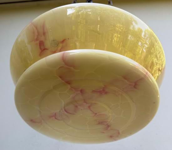 A moulded 1930's Deco cream glass ceiling light shade with red veining.