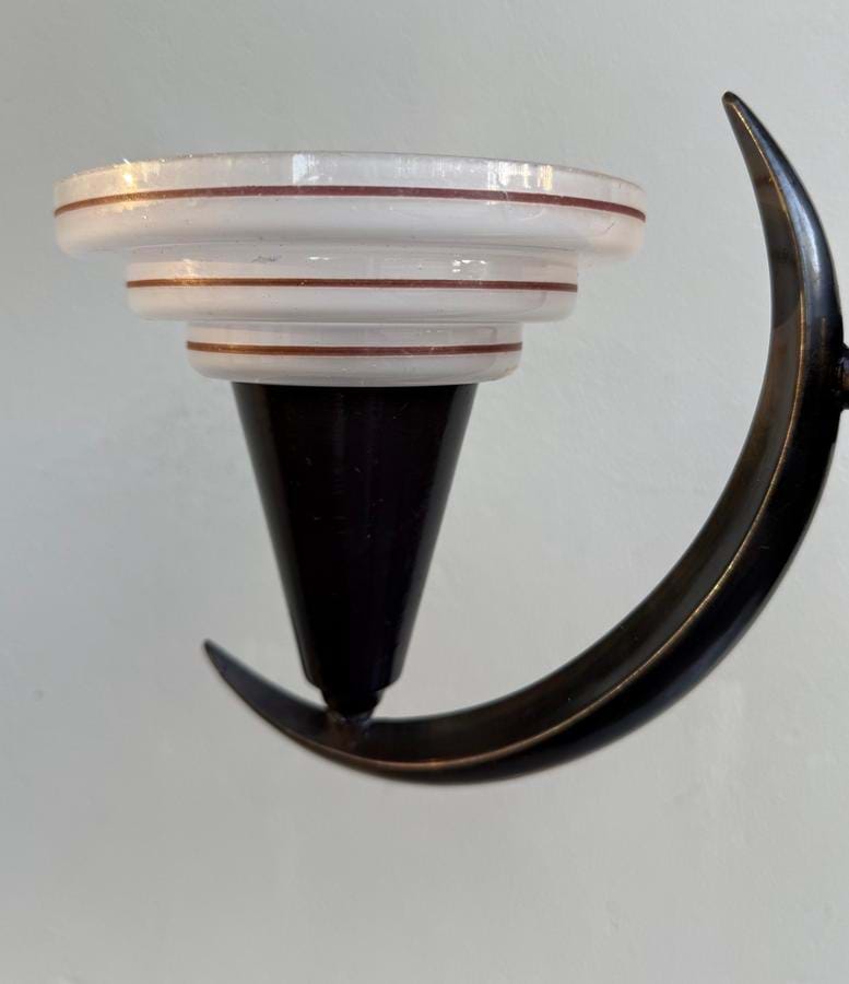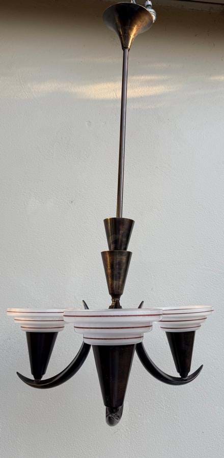 A rare 1930's German Deco/Modernist brass 'crescent moon' 3 light pendant with its original stepped/frosted glass shades.