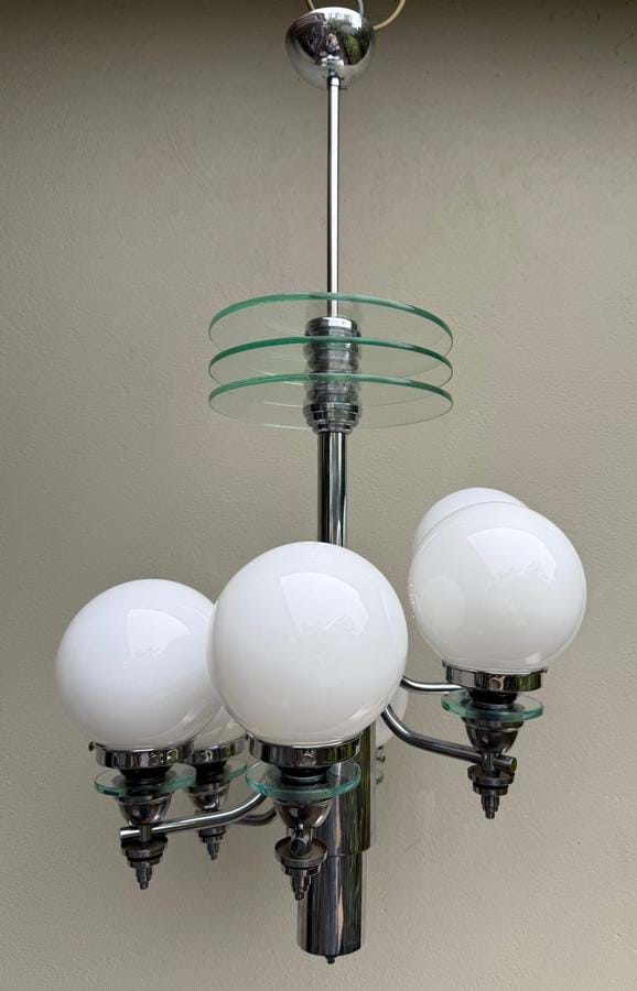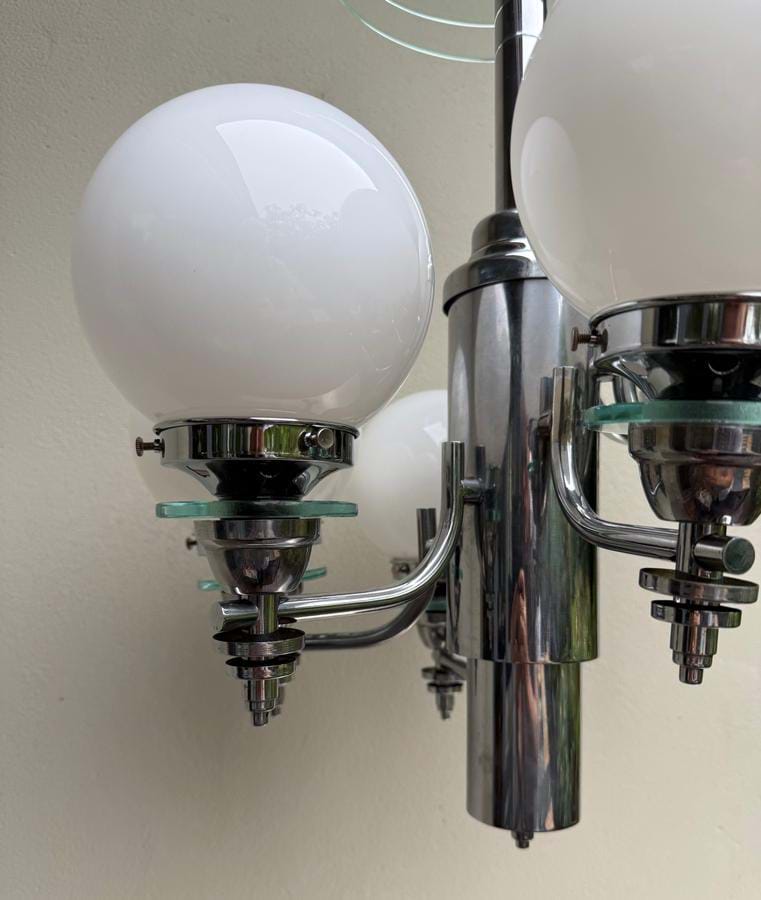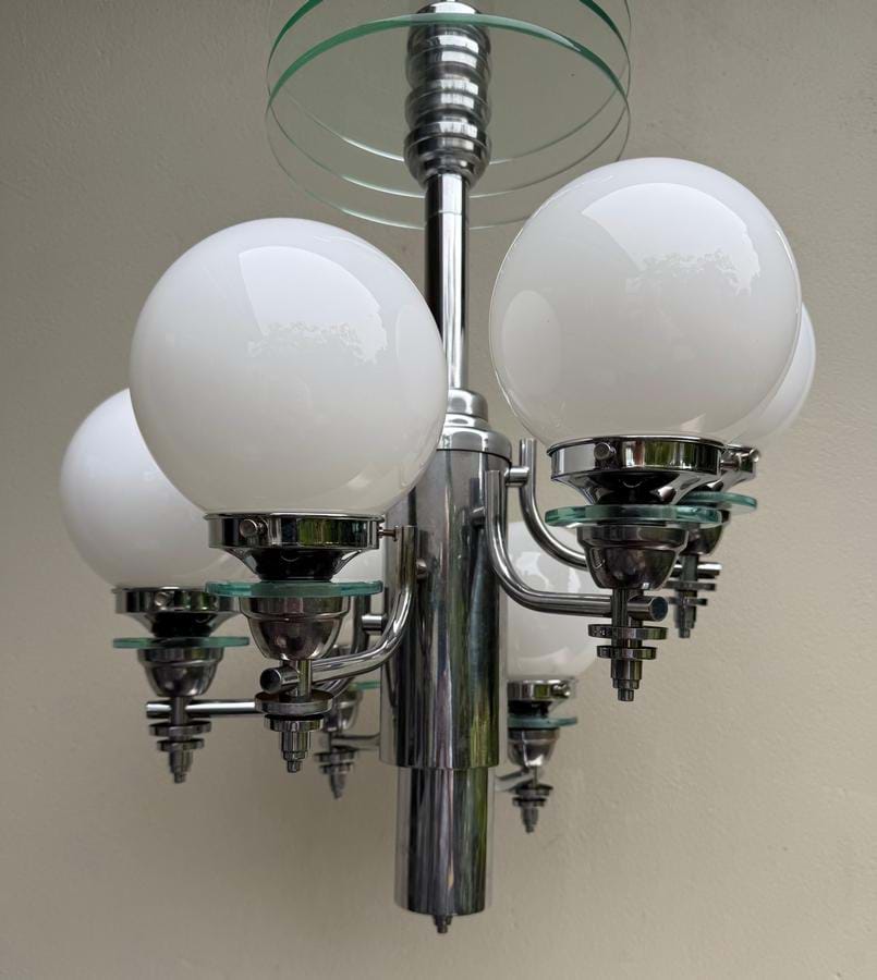 A large 1930's English Deco/Modernist chromed brass 6 light chandelier with white spherical glass shades.