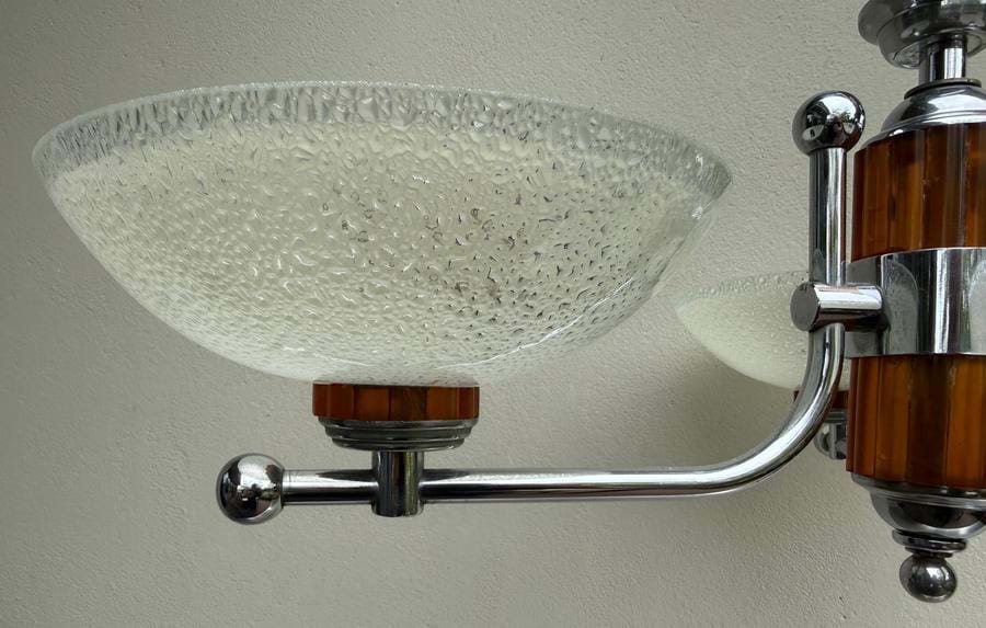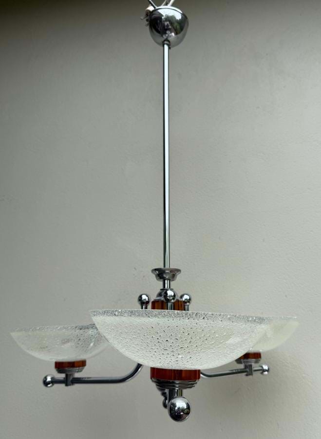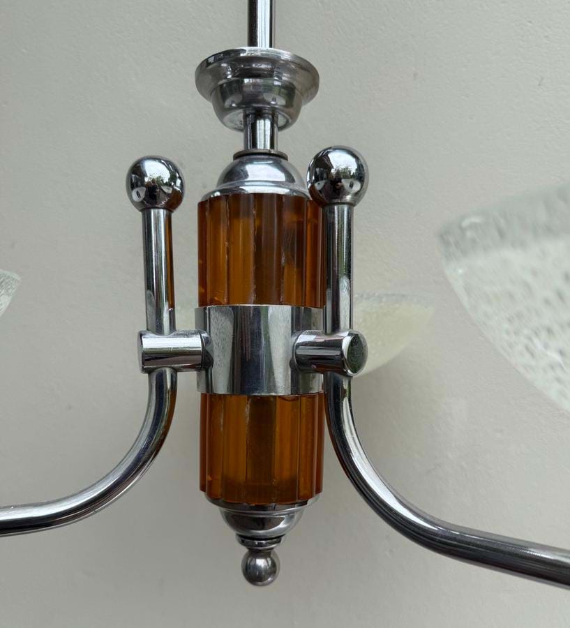 A beautiful 1930's/40's chrome and butterscotch bakelite 3 light pendant made by Franklite (Melbourne).