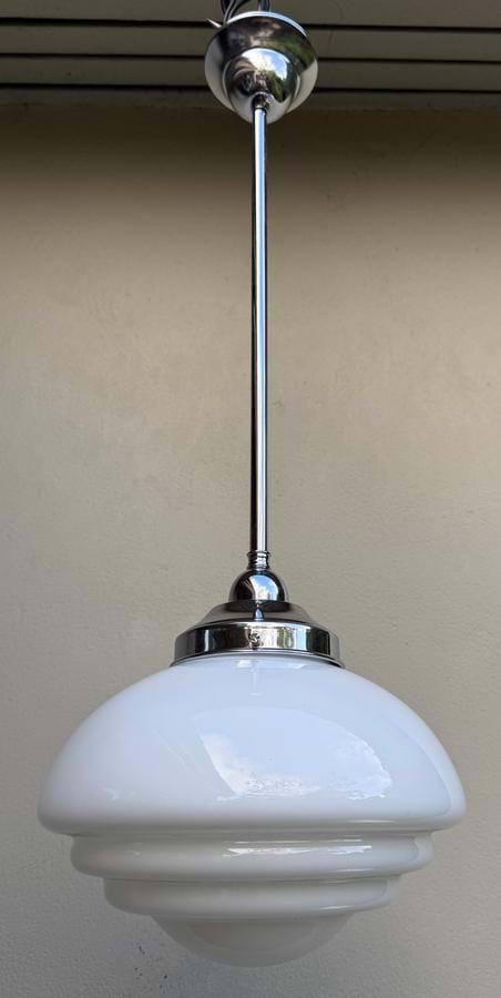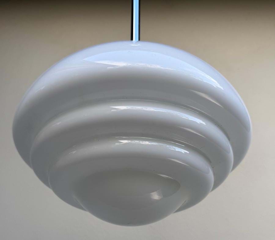 A nice set of 1930's deco stepped white glass ceiling light shades in excellent condition.