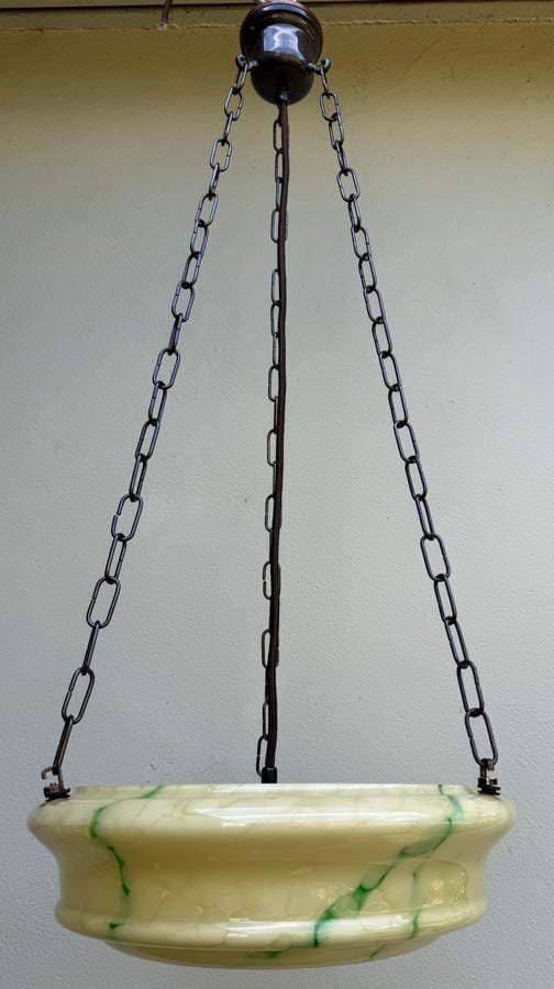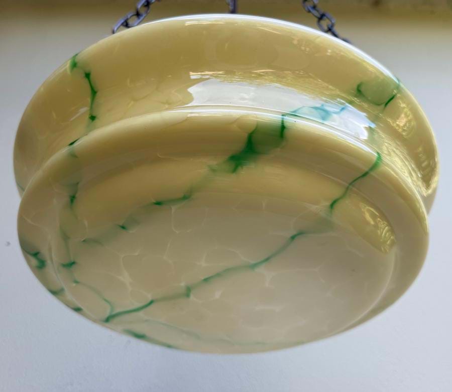 An impressive large 1930's Czech Deco moulded cream glass ceiling light shade with green veining.