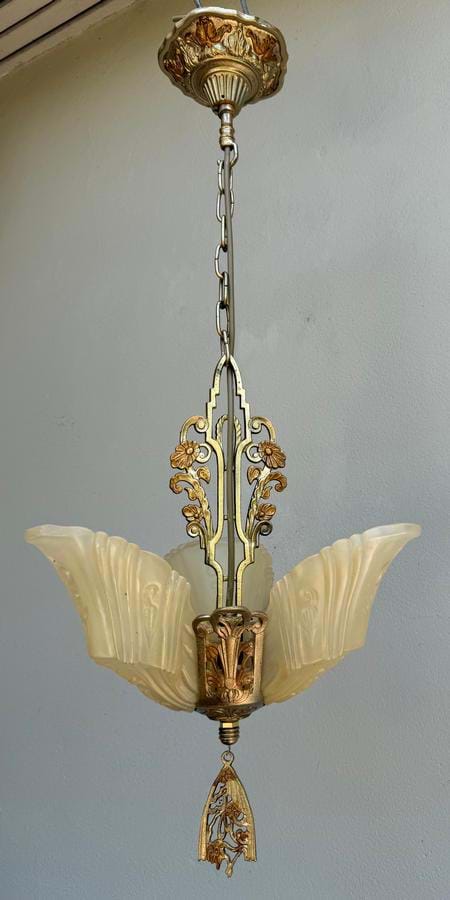 A fine 1930's/40's cast 'slip shade' 3 light chandelier with bronze polychrome finish made by Crown Lighting (Sydney).