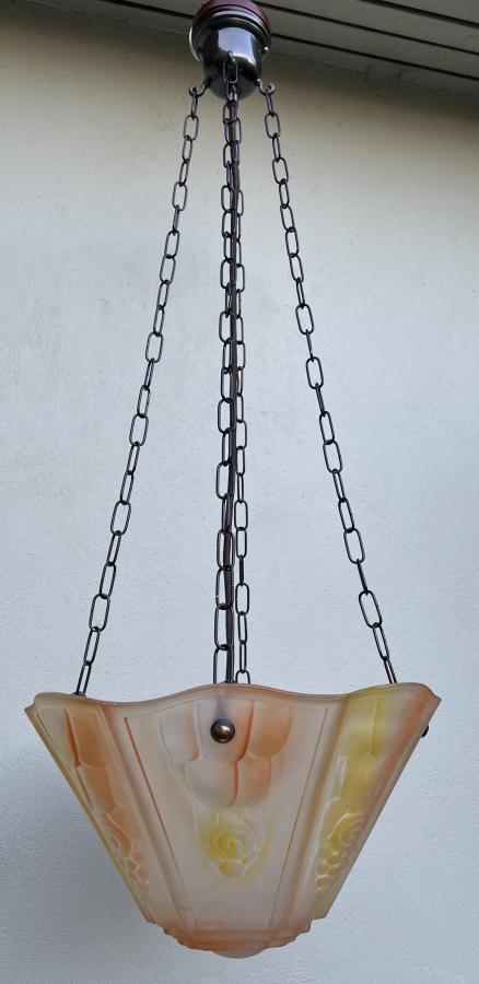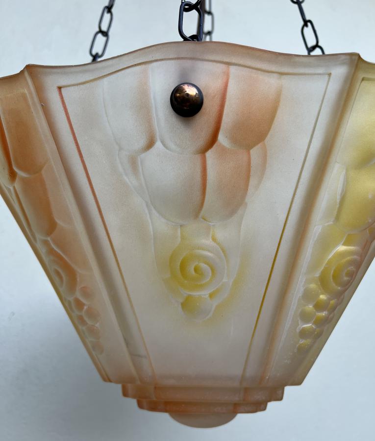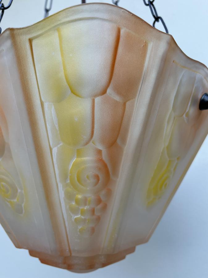 A beautiful large 1930's English Deco moulded glass ceiling light shade.