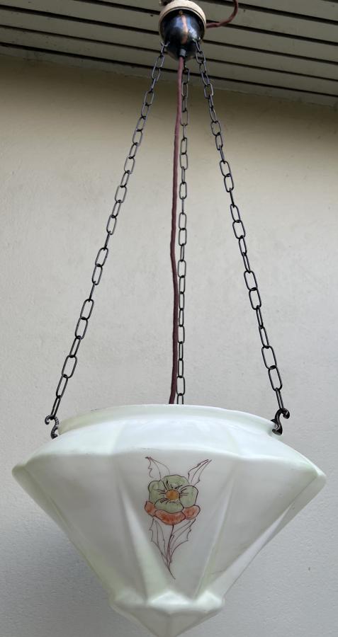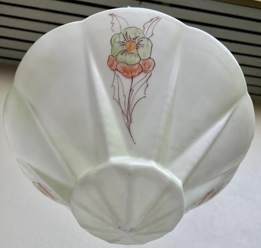 A large 1930's Deco moulded white/green ceiling light shade with hand applied painted decoration.