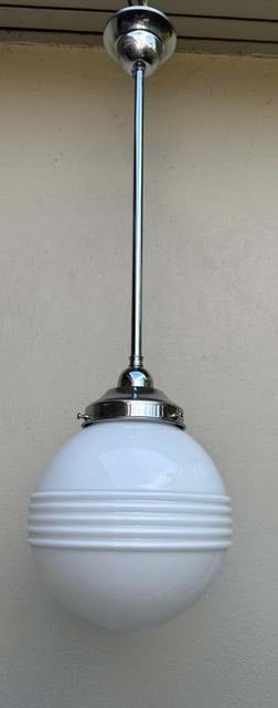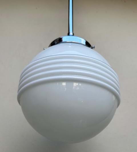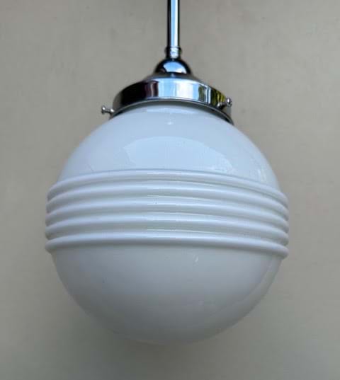 A 1930's Deco moulded white glass 'Saturn Ring' shade with chrome rod suspension.
