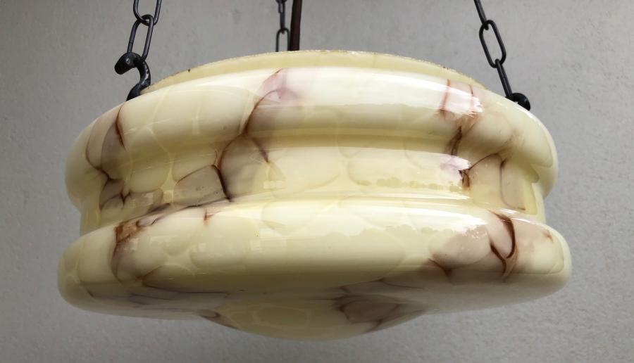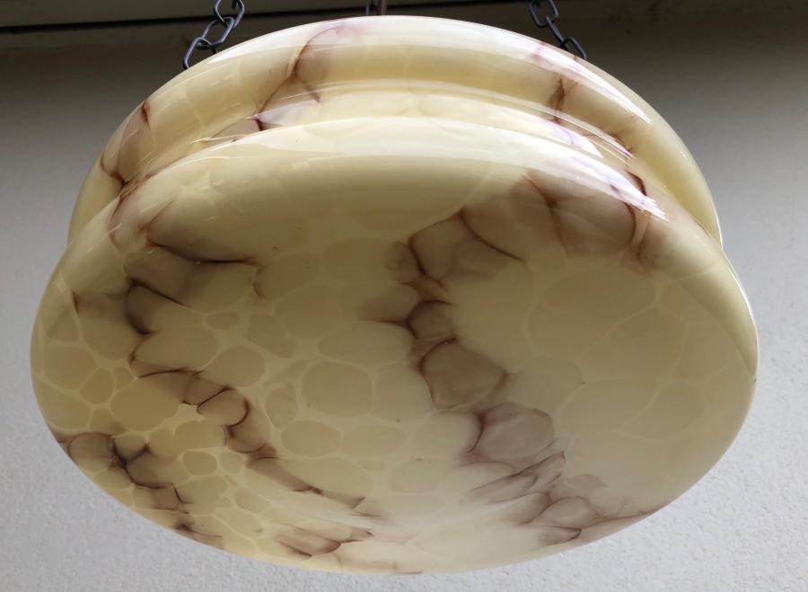 Really nice 1930's cream moulded glass ceiling light shade with brown veining. Great shape and colour. Comes complete with re-wired 3 chain suspension fittings and is ready to hang. Shade is 300mm wide and the overall length/drop (adjustable) is approx. 800mm