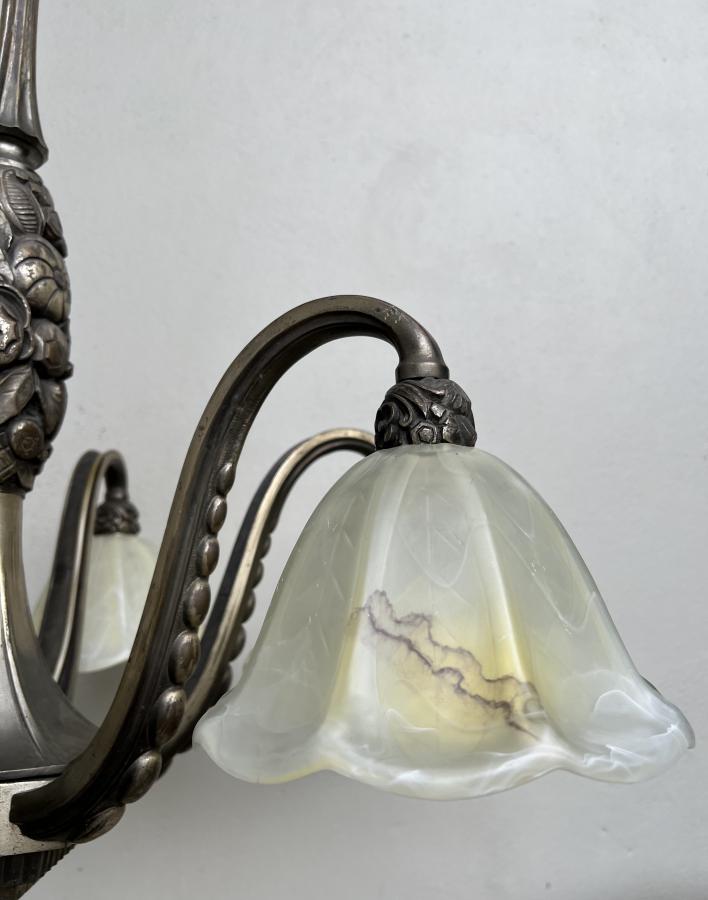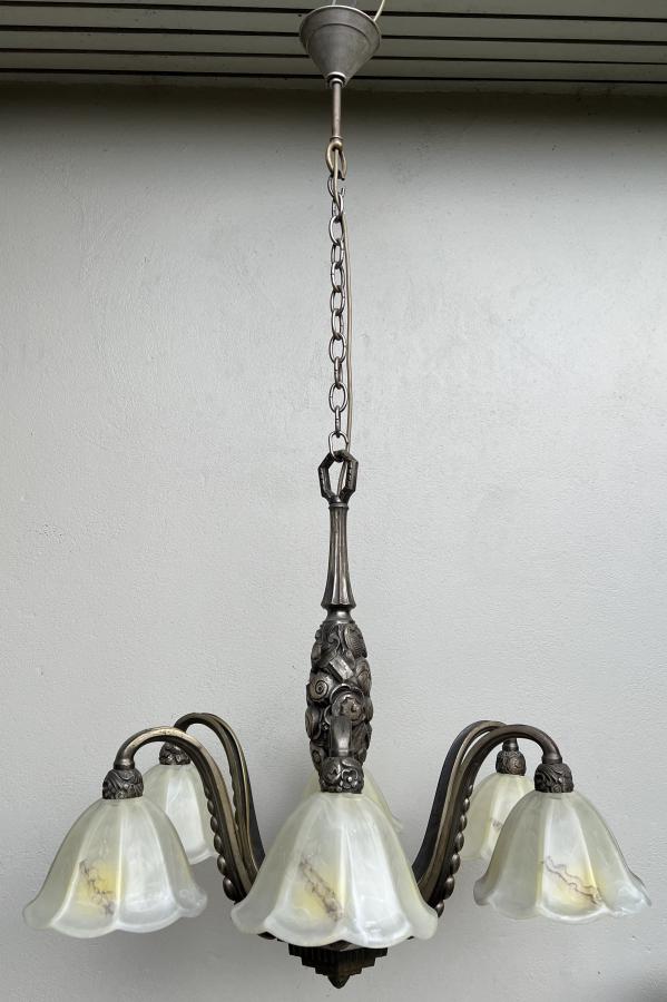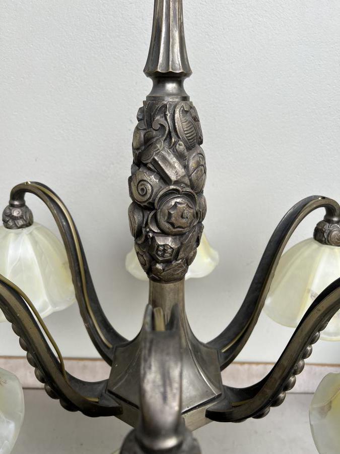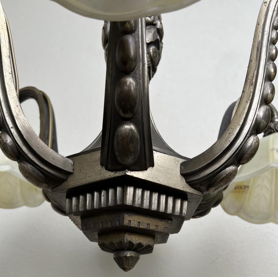 A beautiful large 1930's French Deco nickel plated solid bronze 6 light chandelier with flared off white/yellow-brown glass shades.