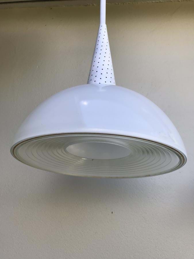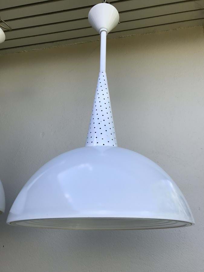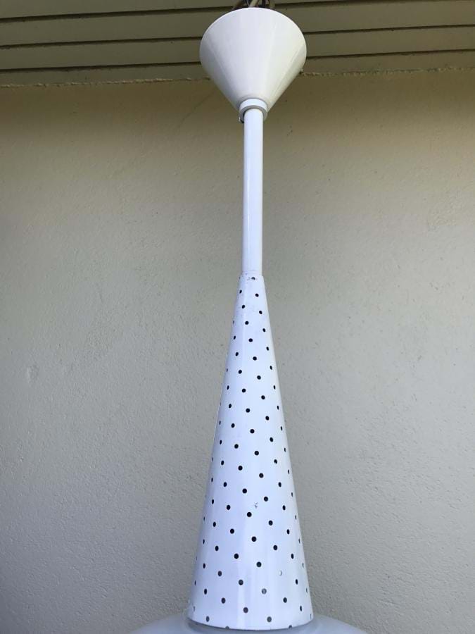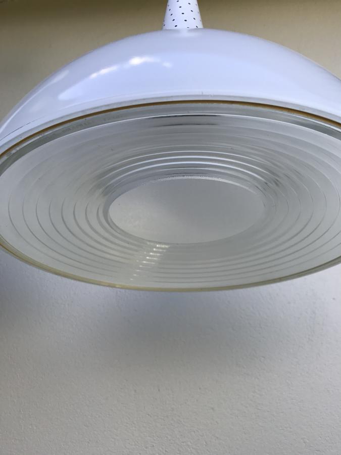 Fantastic large stylish 1950's French ceiling light shade designed by Mathieu Mategot and made by Holophane France. Design was called 'Eratomium'. Dome is white glass and the base is clear/ribbed glass with a centre hole for globe changing. Comes with its original white pole/perforated cone suspension fittings and has been re-wired. Shade is 14 inches/360mm wide and the overall length/drop is 25 inches/640mm. Ceiling cap is 4 inches/100mm across.