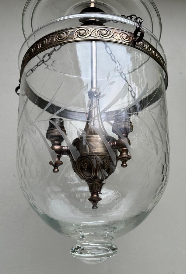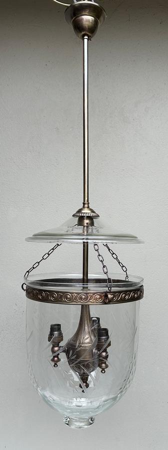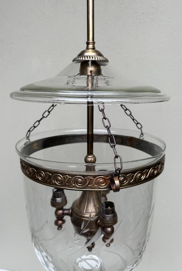Large 1950's/60's glass float lights with moulded foliage/grape design and (re-wired) solid decorative brass suspension fittings.