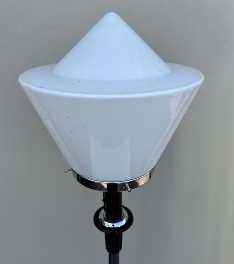 Lamp is in excellent (and re-wired) condition and comes with original...and striking...stepped white glass cone shade.