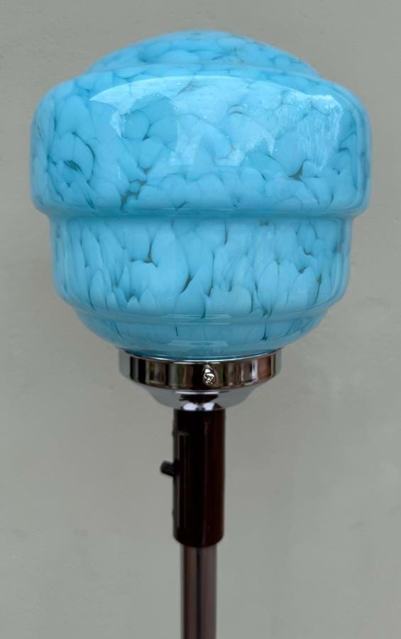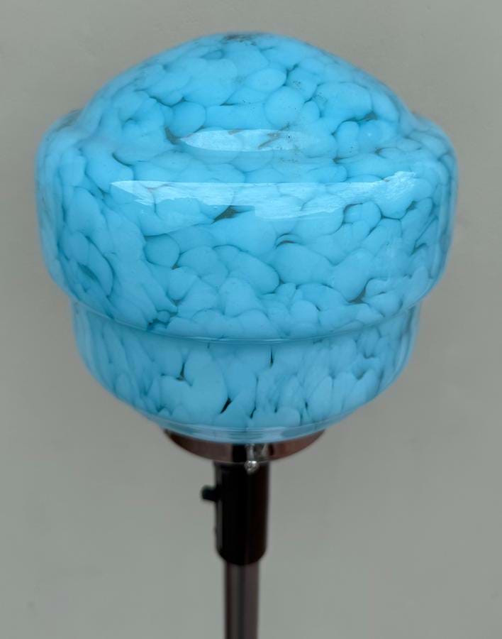 Comes with original moulded blue/stepped-marbled glass shade and is in excellent condition overall.