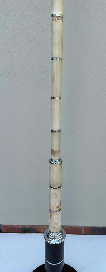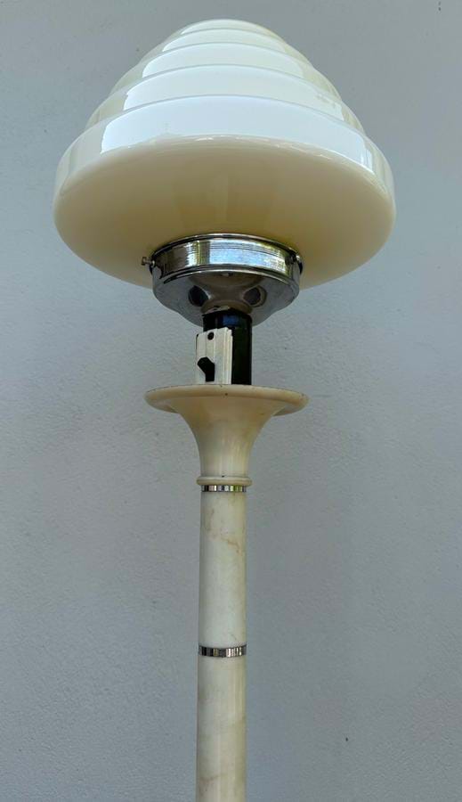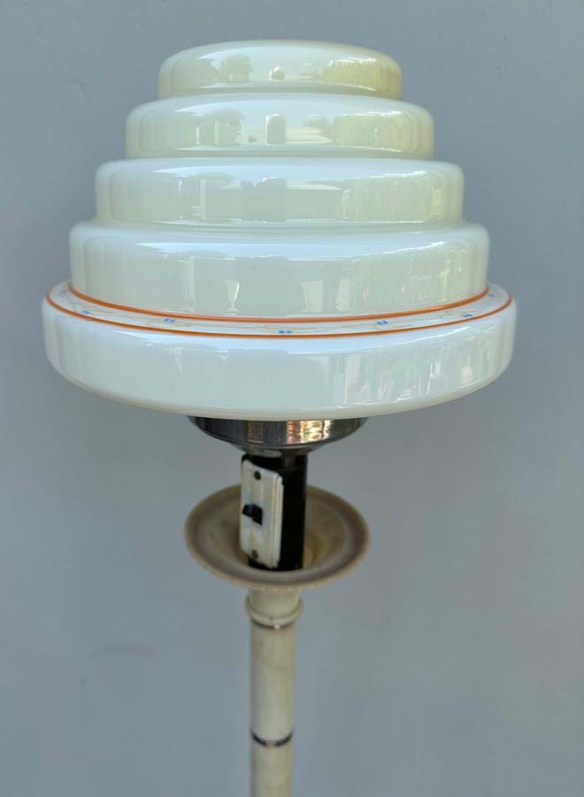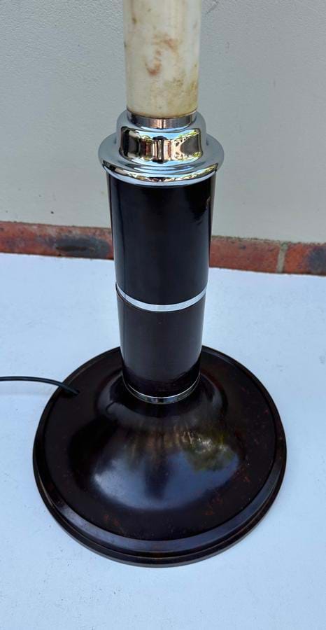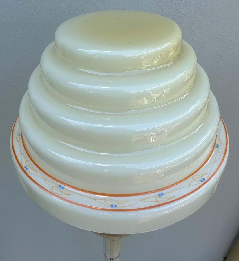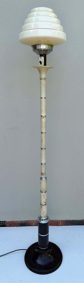 A beautiful 1930's deco chrome and segmented bakelite column floor lamp with original cream stepped/hand decorated glass shade.