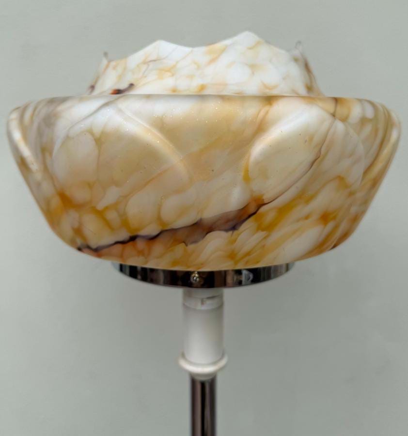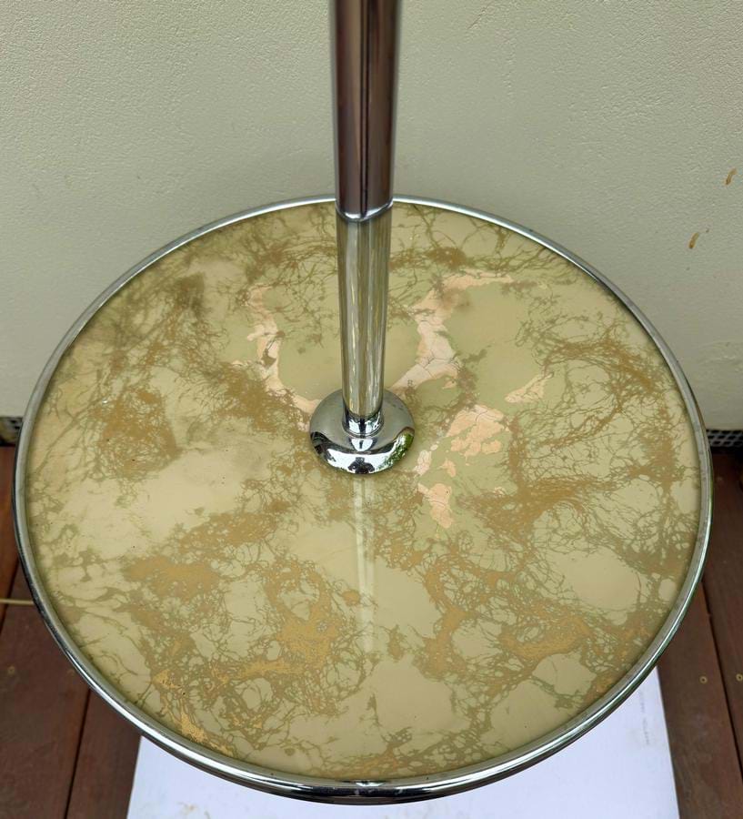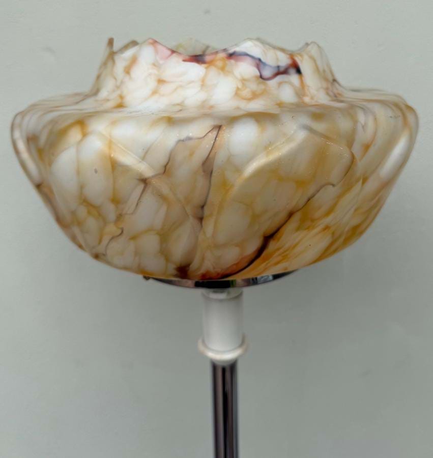 This one comes with the very useful cream/gold glass topped table and original moulded off white/orange/purple-brown veined glass shade.