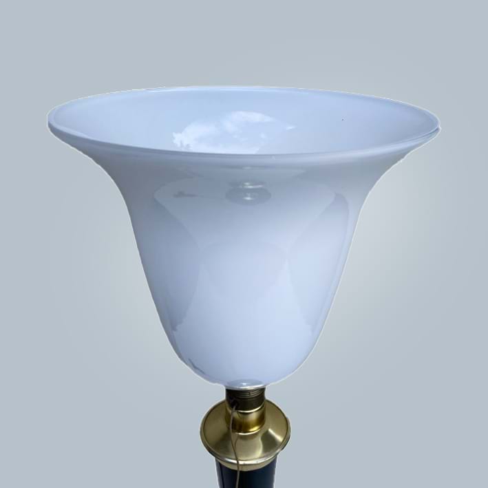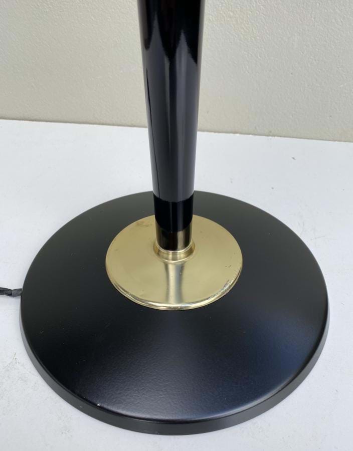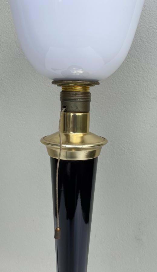 A beautiful tall 1930's/40's brass/black French 'Mazda' lamp with its original white glass bell shade.