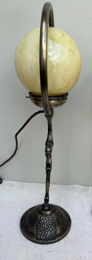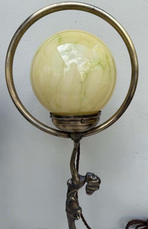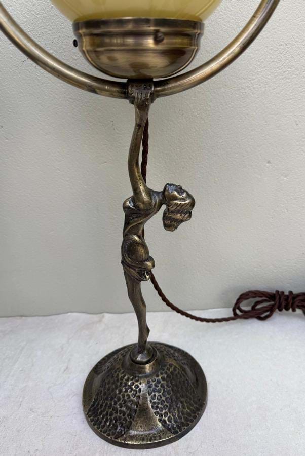A great pair of 1930's solid brass English Deco lady ring lamps with their original cream/green marbled glass shades.