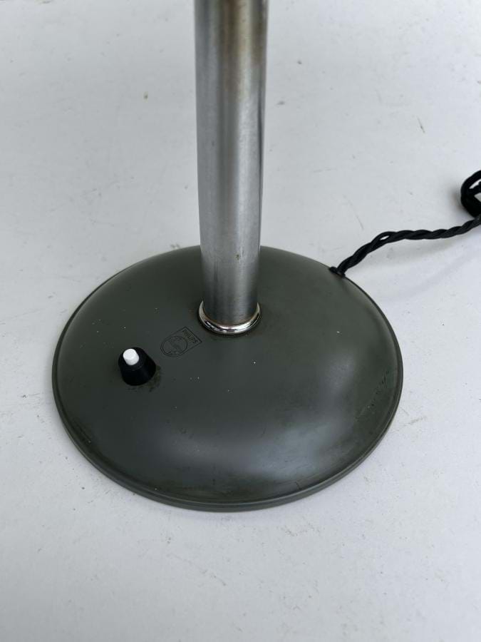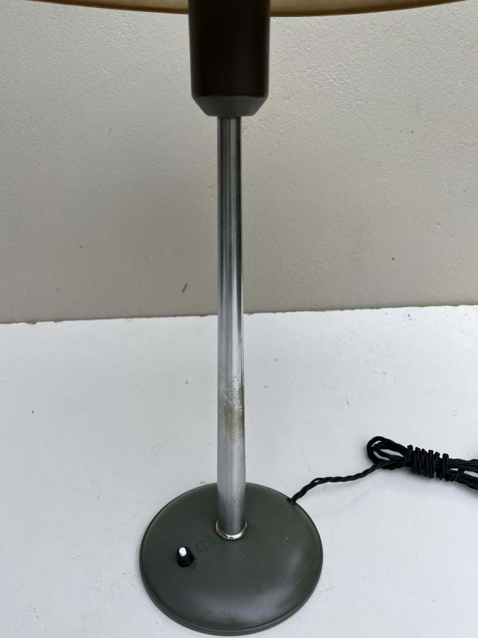 This desirable lamp is beautifully designed, with a tapered chrome column and (original) blue/grey shade and base.