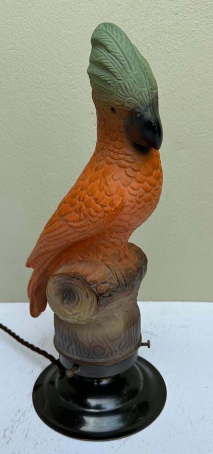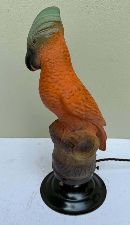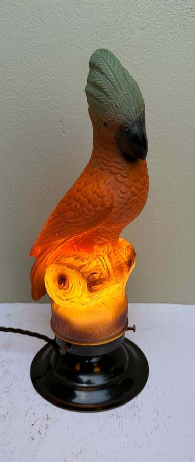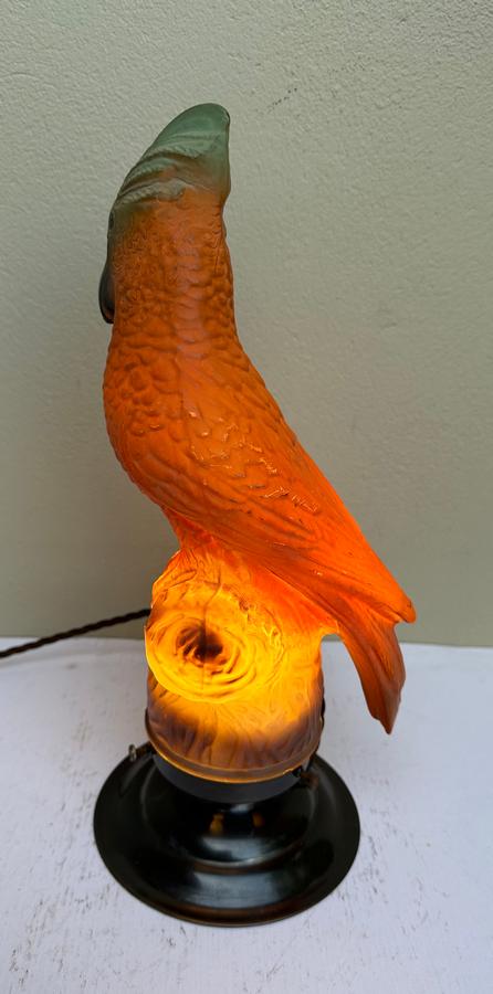 A tall and attractive 1930's American Deco glass cockatoo night lamp shade made by Tiffin.