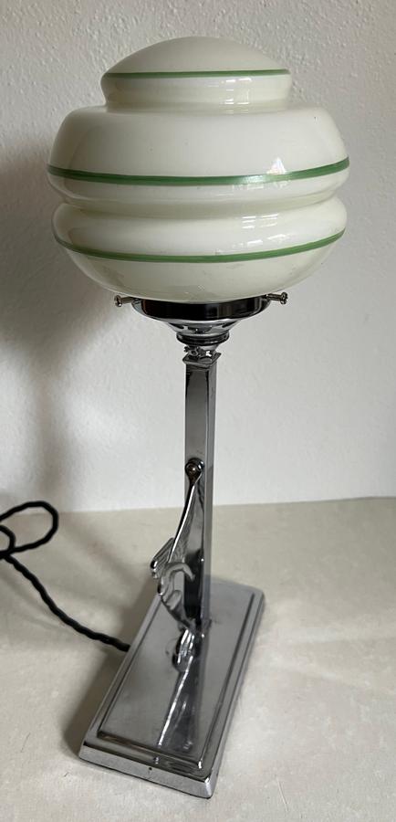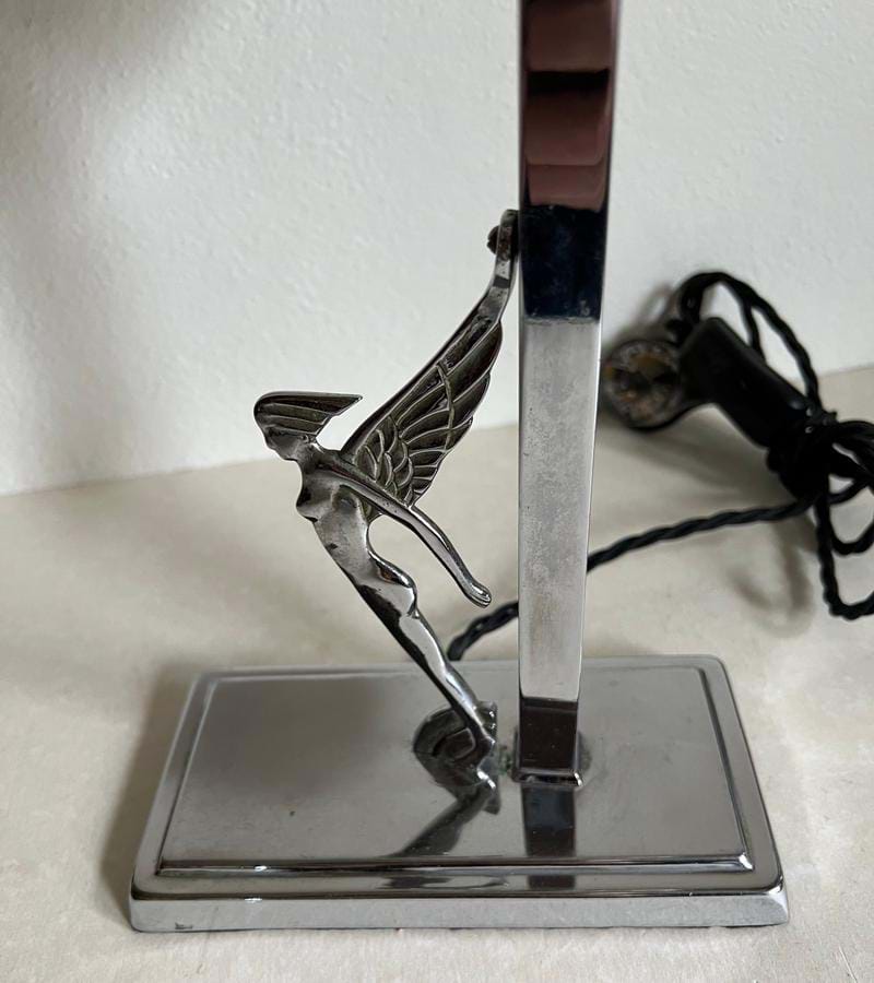 A classic 1930's English Deco chrome winged lady lamp with original stepped cream/green banded glass shade.