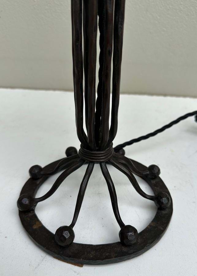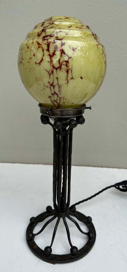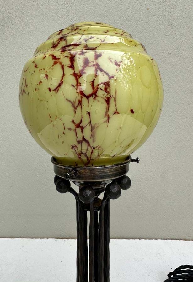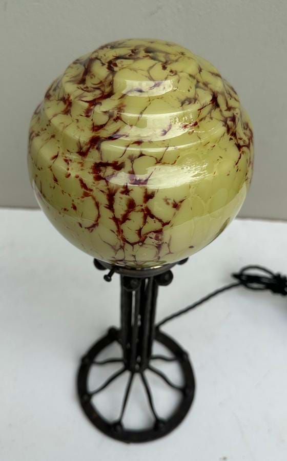 A really nice 1930's French Deco hand forged black iron and brass table lamp with original stepped cream/brown glass shade.