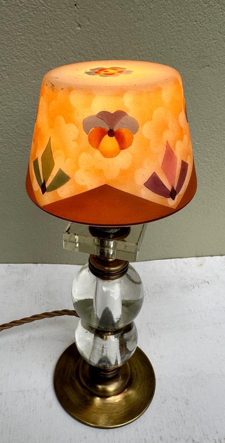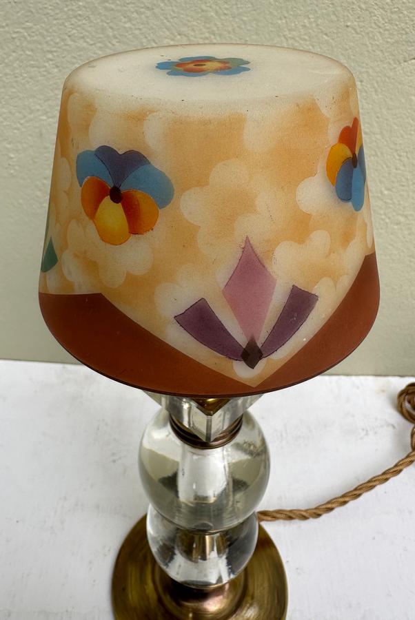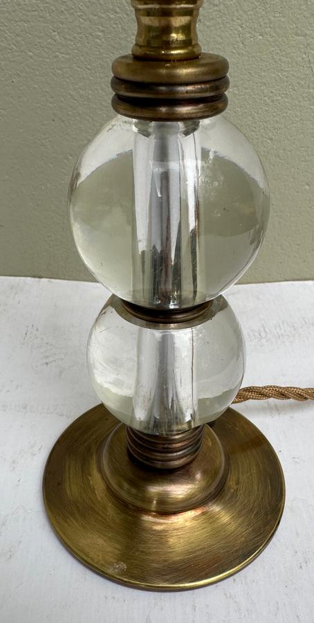 A petite 1930's French Deco brass lamp with solid glass column orbs and original hand decorated Bohemian Bellova glass shade.