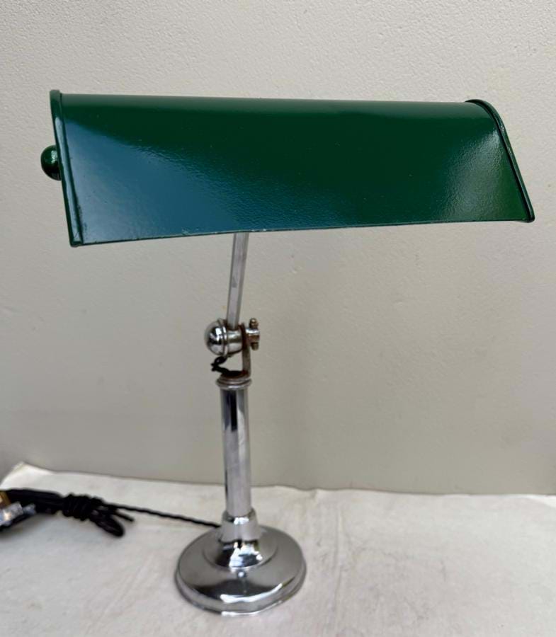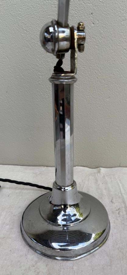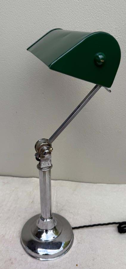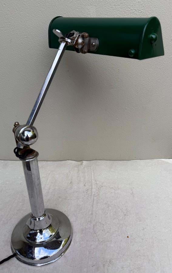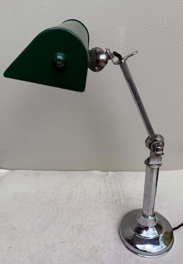 An unusual 1930's French Deco chrome articulated desk lamp with green metal shade.