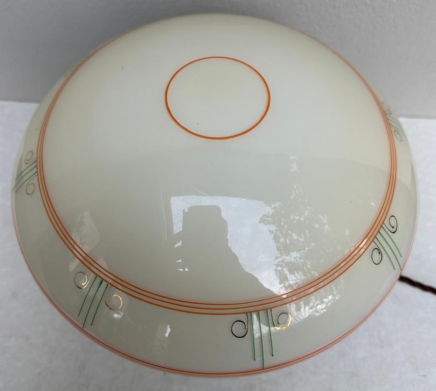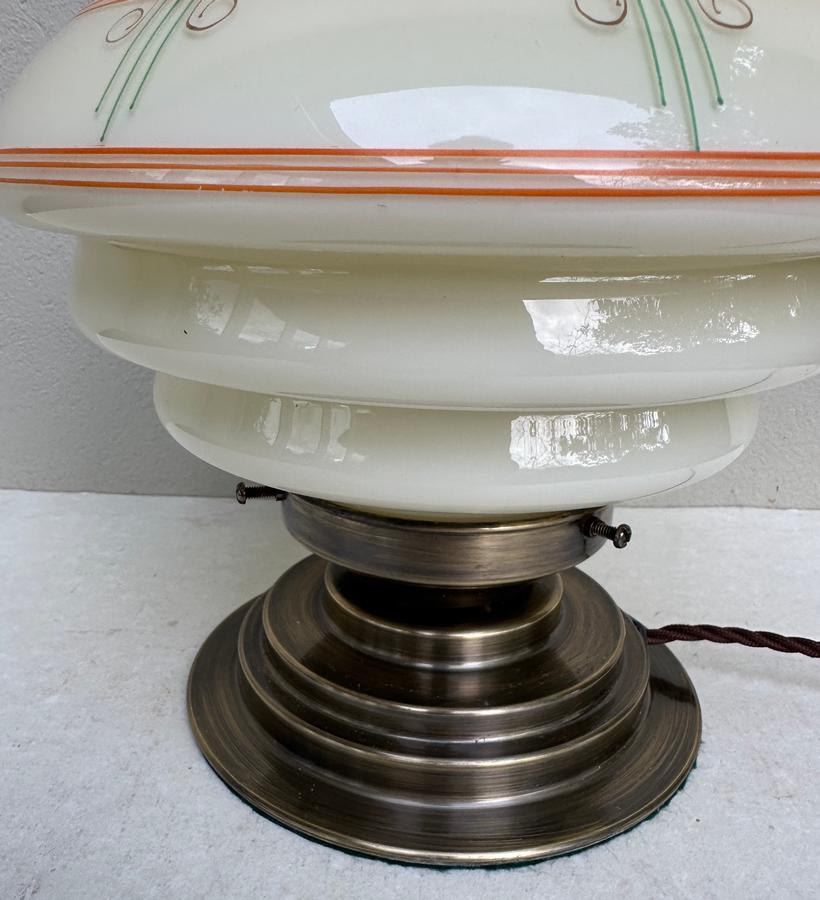 A large 1930's Deco stepped brass lamp base with original cream stepped/decorated glass shade.