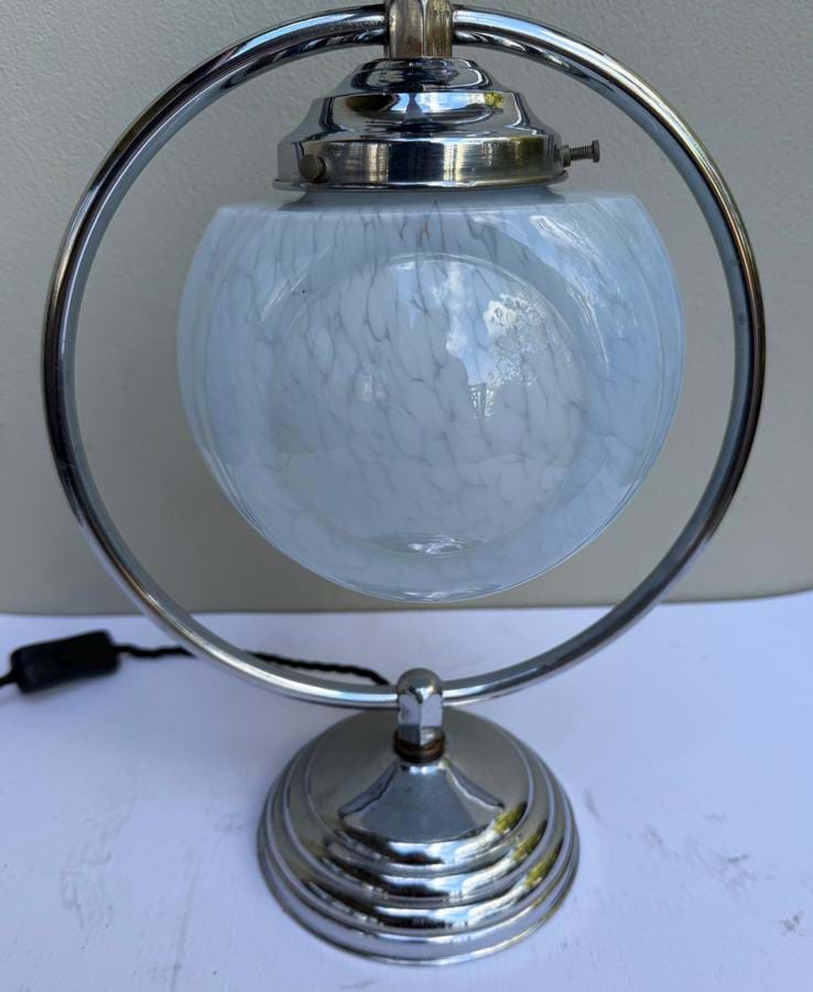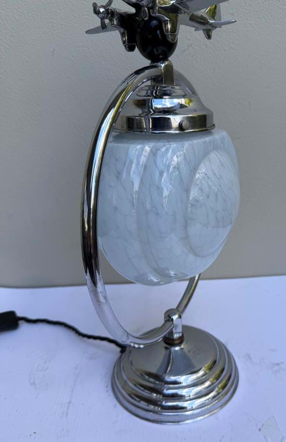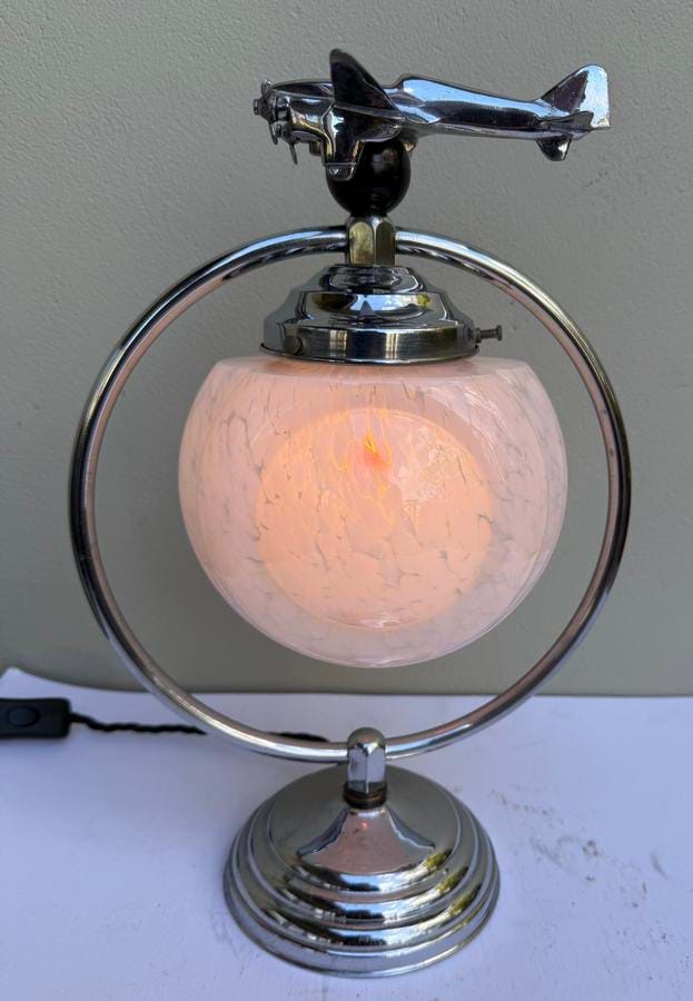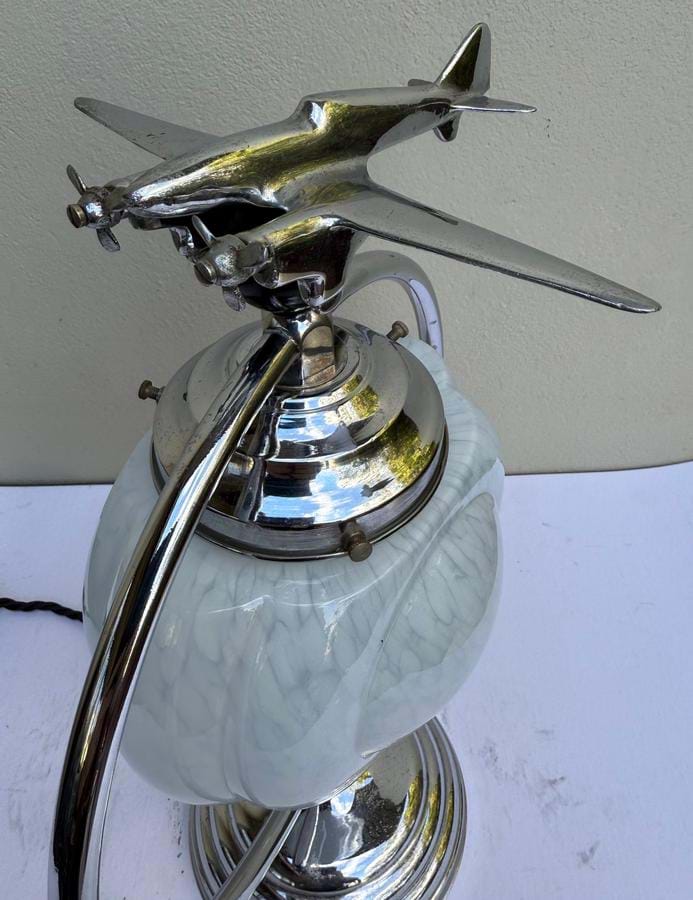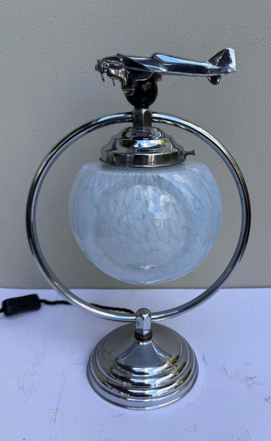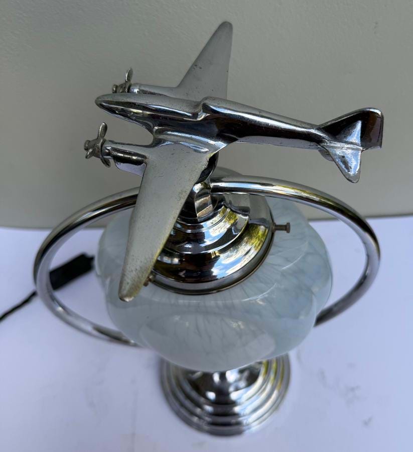 A great 1930's English Deco chromed brass ring lamp with Dh 'Comet' aeroplane sitting atop a black bakelite ball...!