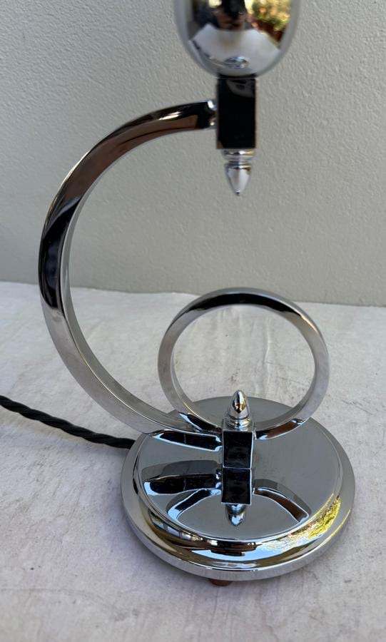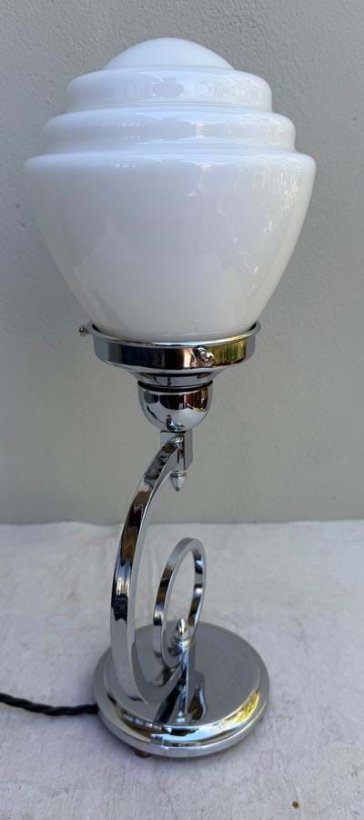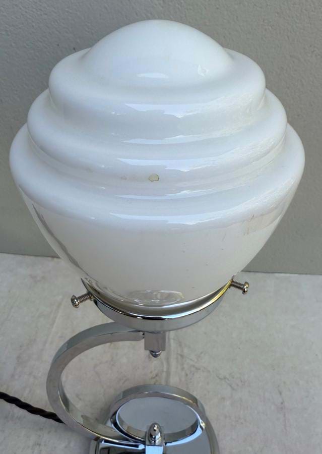 An elegant 1930's American Deco chromed brass curved arm column lamp with original stepped white glass shade.
