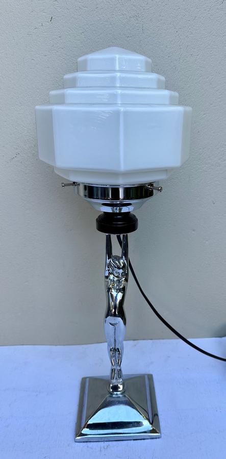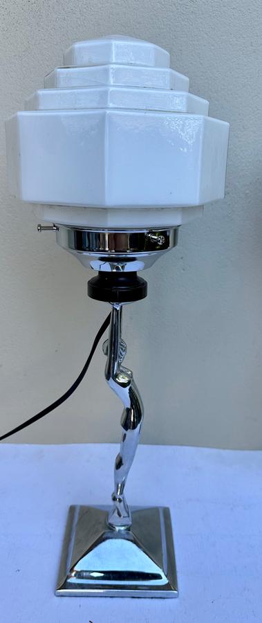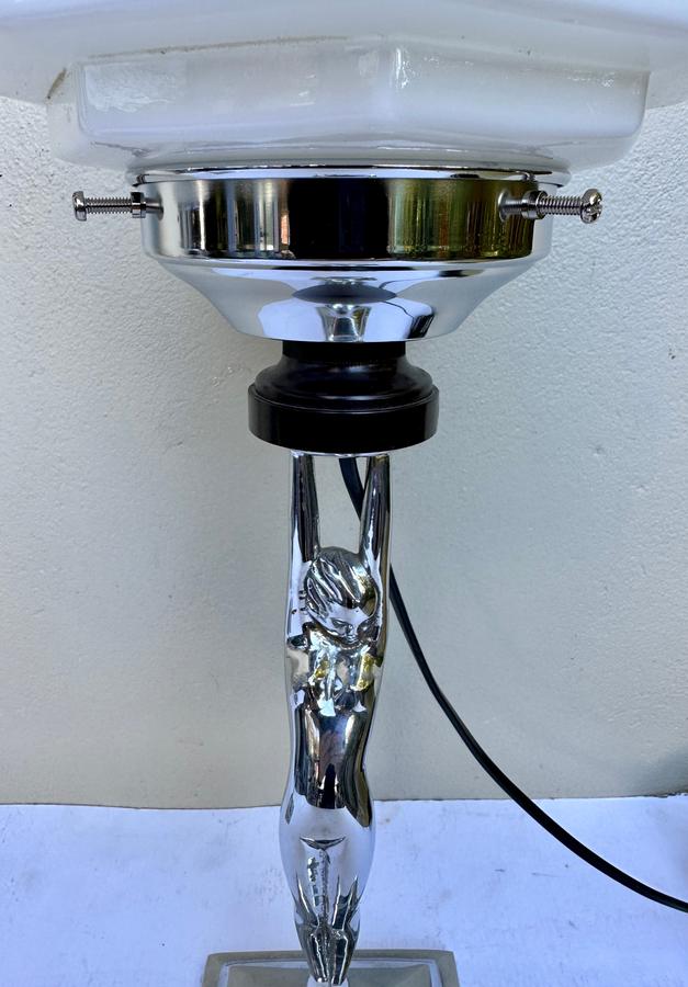 A great pair of 1930's Deco chromed brass lady 'Diana' lamps with original white glass skyscraper shades.