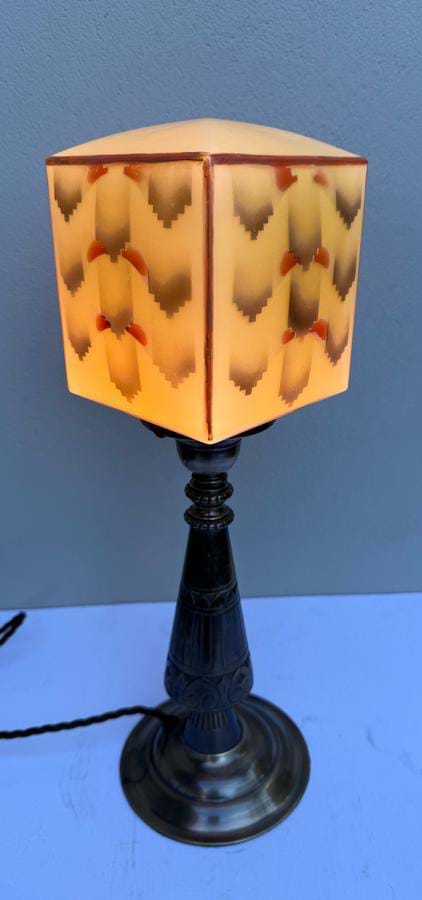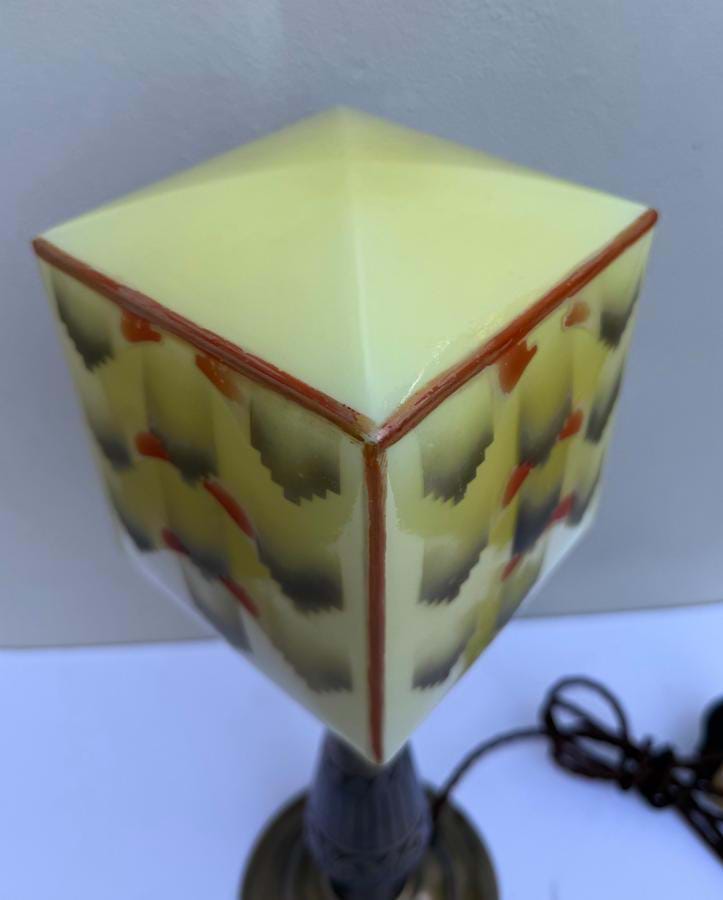 Lamp comes with original square yellow glass shade with typical...for the time/place..orange/grey 'spritzdecor' design.