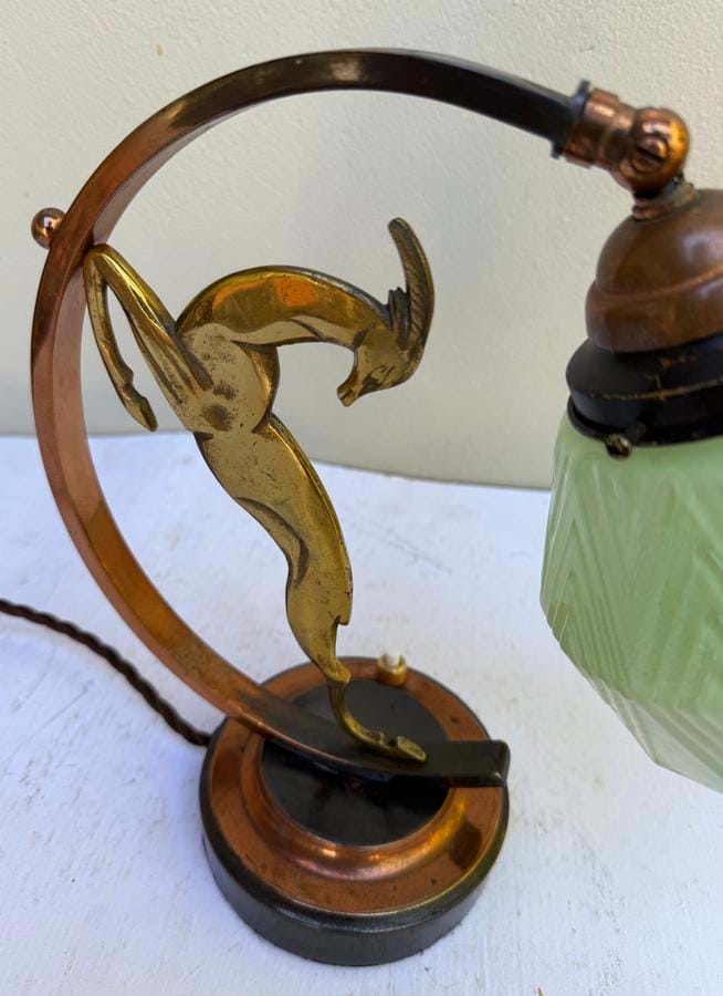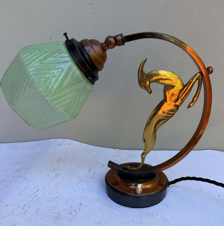 Comes with original moulded green glass shade...which is adjustable in angle. Measures 260mm tall by approx 220mm wide.