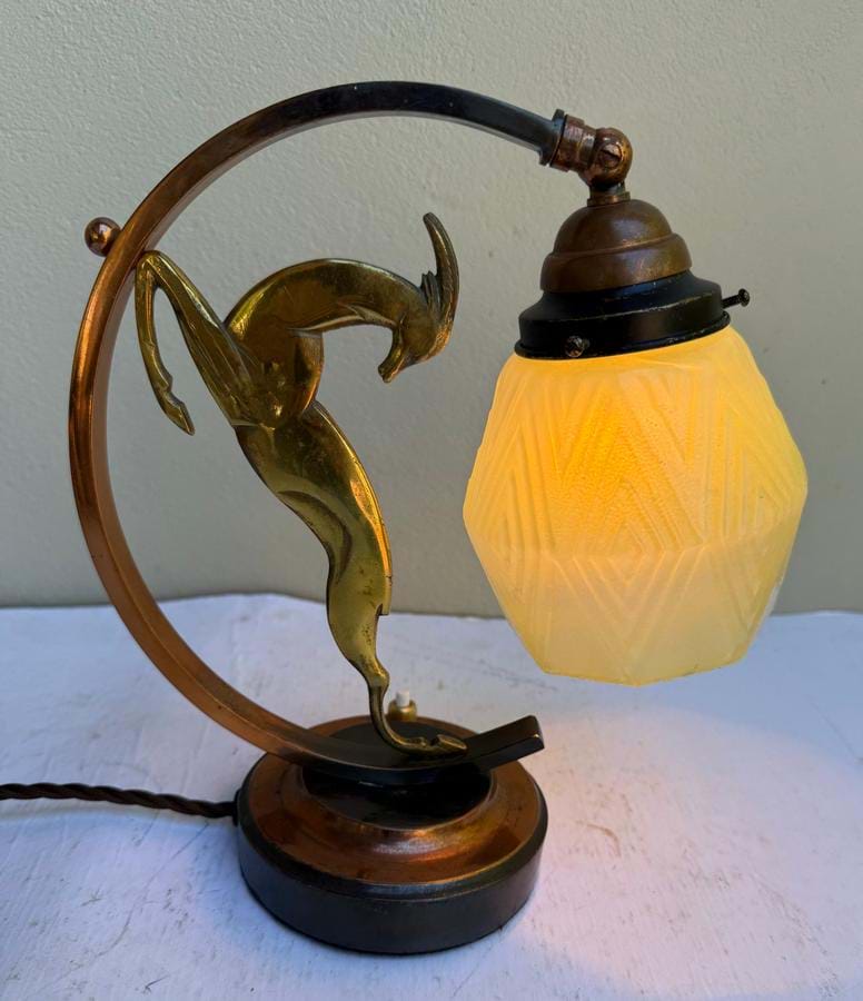 A 1930's French Deco curved arm brass lamp with cast feet motif.