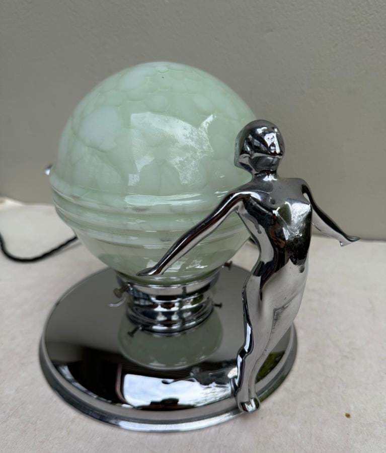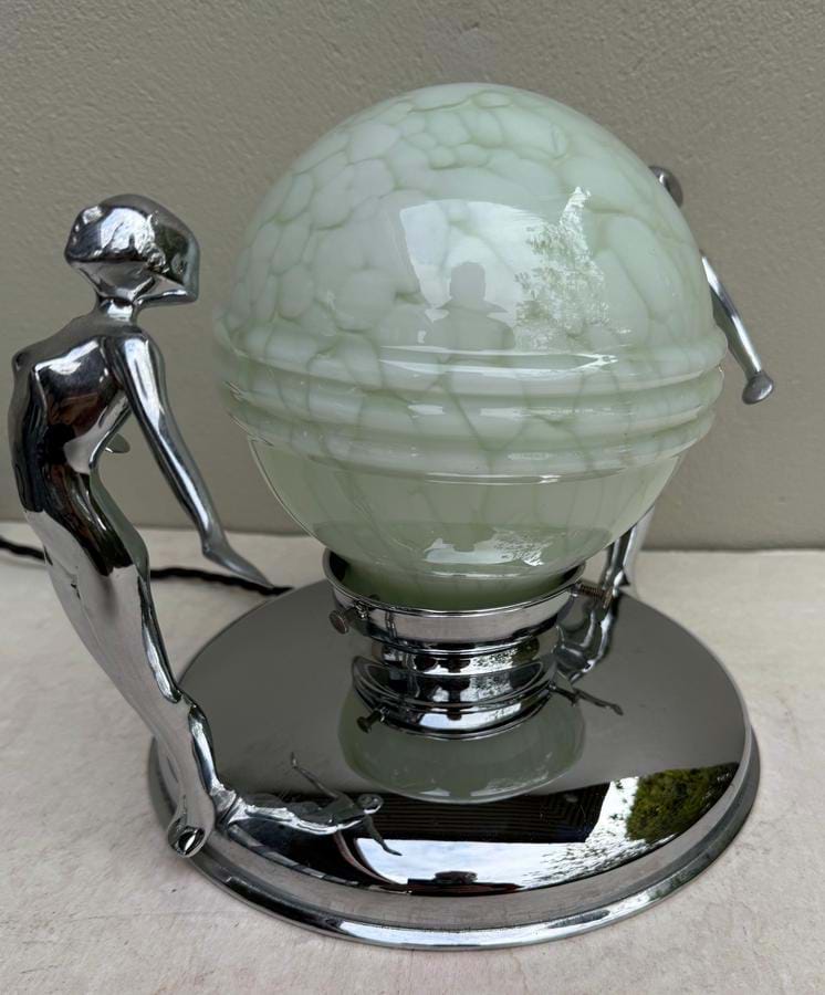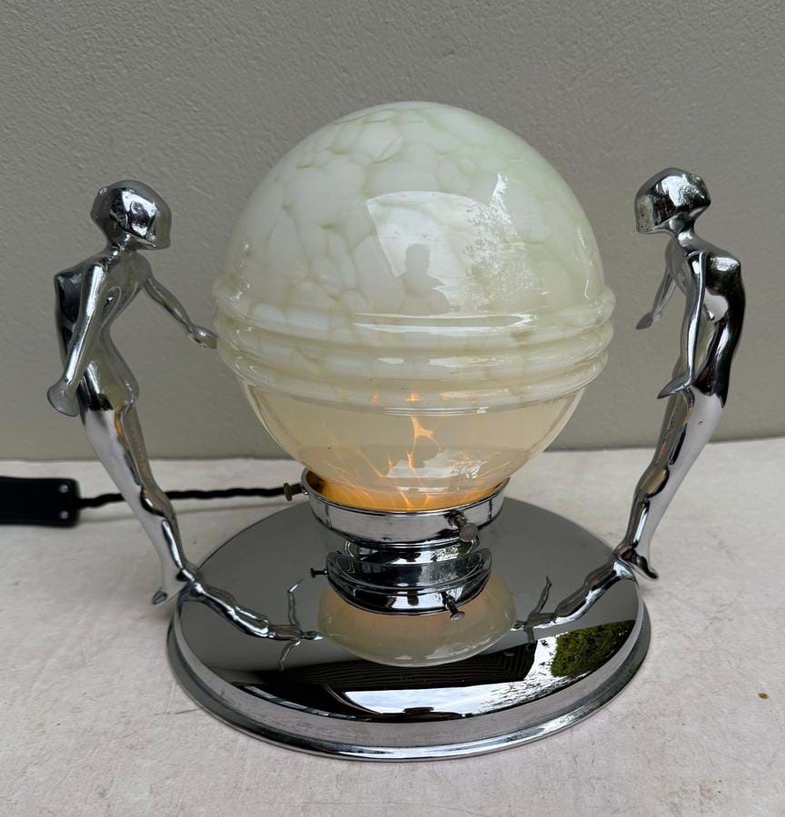 A rare large 1930's Australian Deco chrome twin lady lamp with stylised figures and original green marbled glass 'Saturn rings' glass shades.