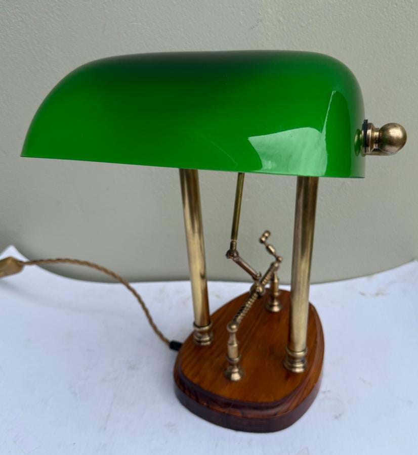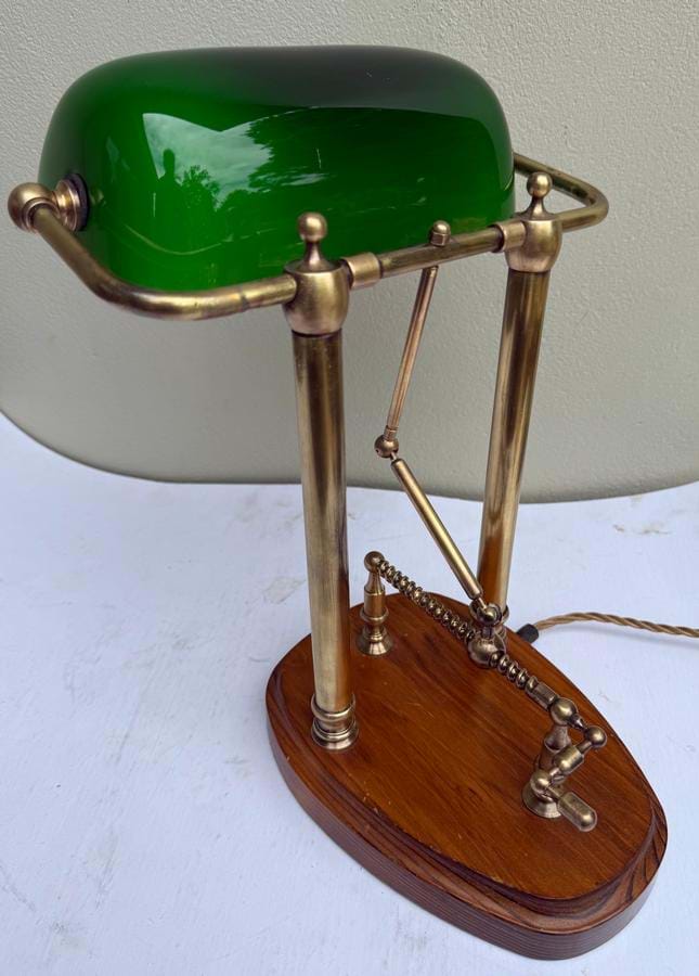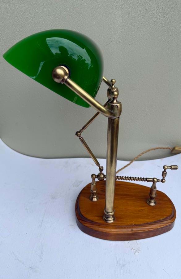 An unusual....and very well made....c.1980's brass bankers lamp on a solid timber base....with a mechanical shade adjustment mechanism!